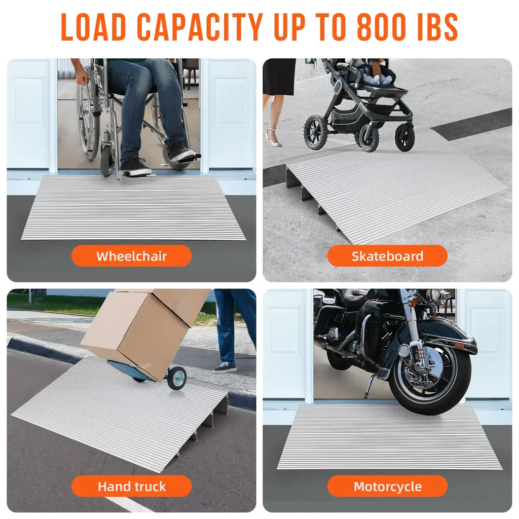 Our doorway ramp, available in 3", 4", and 5" rises, provides a secure solution for smooth transitions over thresholds, catering to individuals facing mobility challenges. Crafted from durable aluminum with a non-slip surface, it supports up to 800 lbs, ensuring reliable access for wheelchairs, scooters, and walkers, both indoors and outdoors. Key Features: