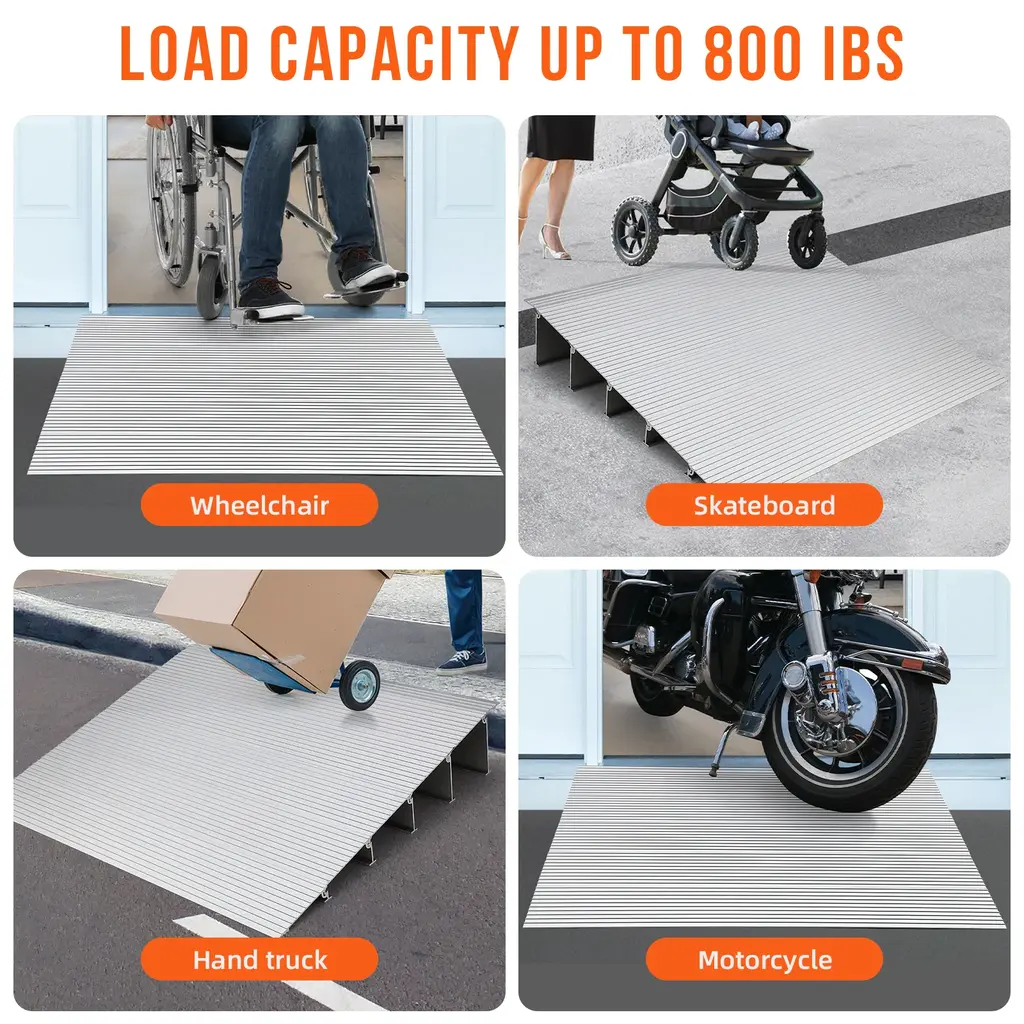 Our doorway ramp, available in 3", 4", and 5" rises, provides a secure solution for smooth transitions over thresholds, catering to individuals facing mobility challenges. Crafted from durable aluminum with a non-slip surface, it supports up to 800 lbs, ensuring reliable access for wheelchairs, scooters, and walkers, both indoors and outdoors. Key Features: