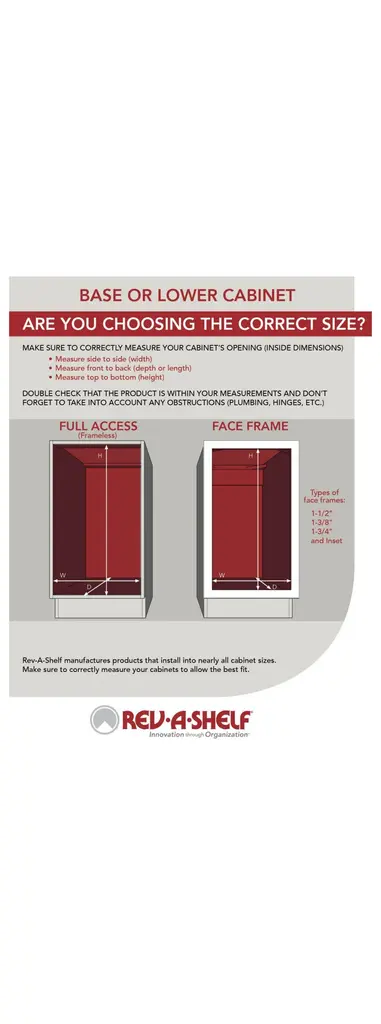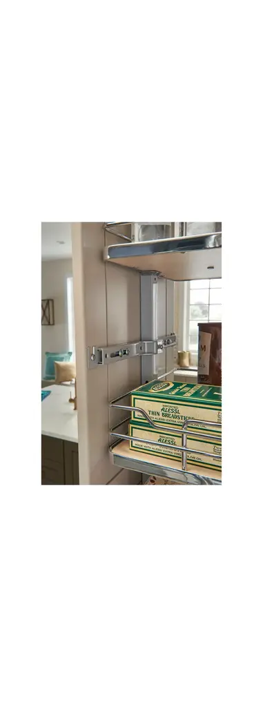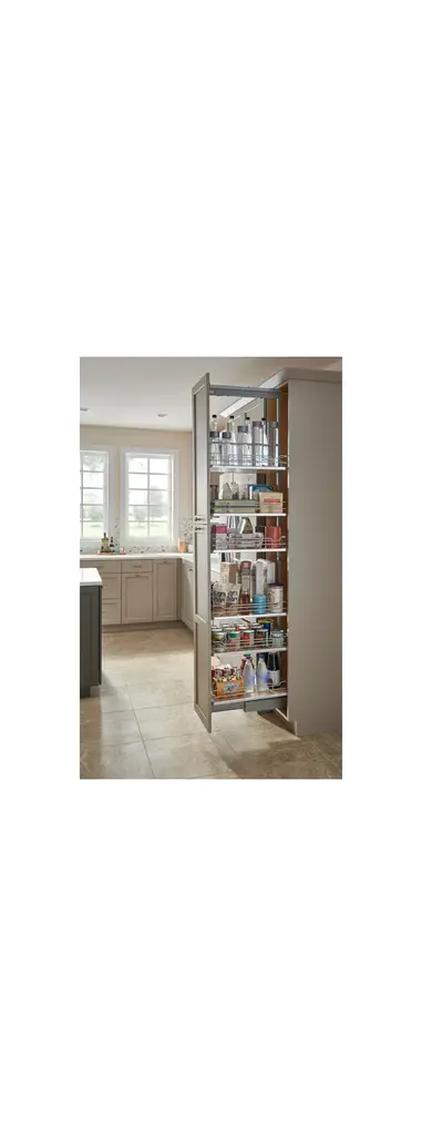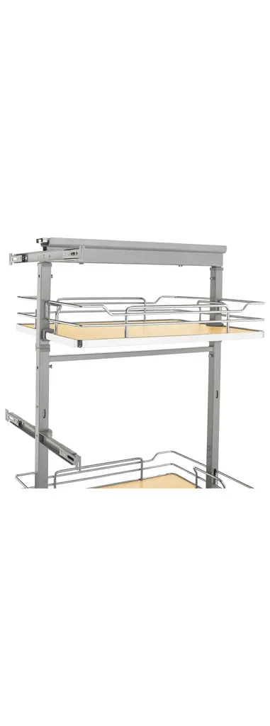 Rev-A-Shelf's 5300 Pullout Pantry Series is the answer to your full access (frameless) cabinetry needs. The series now offers increased basket depths for 24" deep cabinetry and comes in five different widths and four height ranges. Available in a beautiful maple or contemporary gray solid bottom to match every kitchen style, the 5300 Series glides quietly on 250 lb. rated full-extension, soft-close slide system. Features micro-adjustable door mounting and all kits are packaged with frame, baskets and hardware.Included: (4) Maple Solid bottom baskets, (1) Frame, (1) 200lb slide system, (2) door mount brackets, hardwareSlide Type: 250lb Full-Extension Progressive Slides w/Soft-CloseBasket Dims: 13" W x 20.81" D x 3.6" HAdjustable frame height: 50-3/4" to 58-1/4"Due to size/weight item normally ships via LTL carrierOptional extender brackets (57-EXTEND-1) allows you to move top basket all the way up (Sold separately)Designed for a cabinet opening of 13-1/2" to 18"Door mount brackets: Adjustable door mount brackets are Included: and required for operationConstruction: Heavy-Duty Metal frame with solid bottom surfaceProfessional installation recommended
