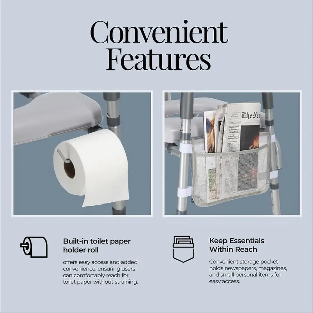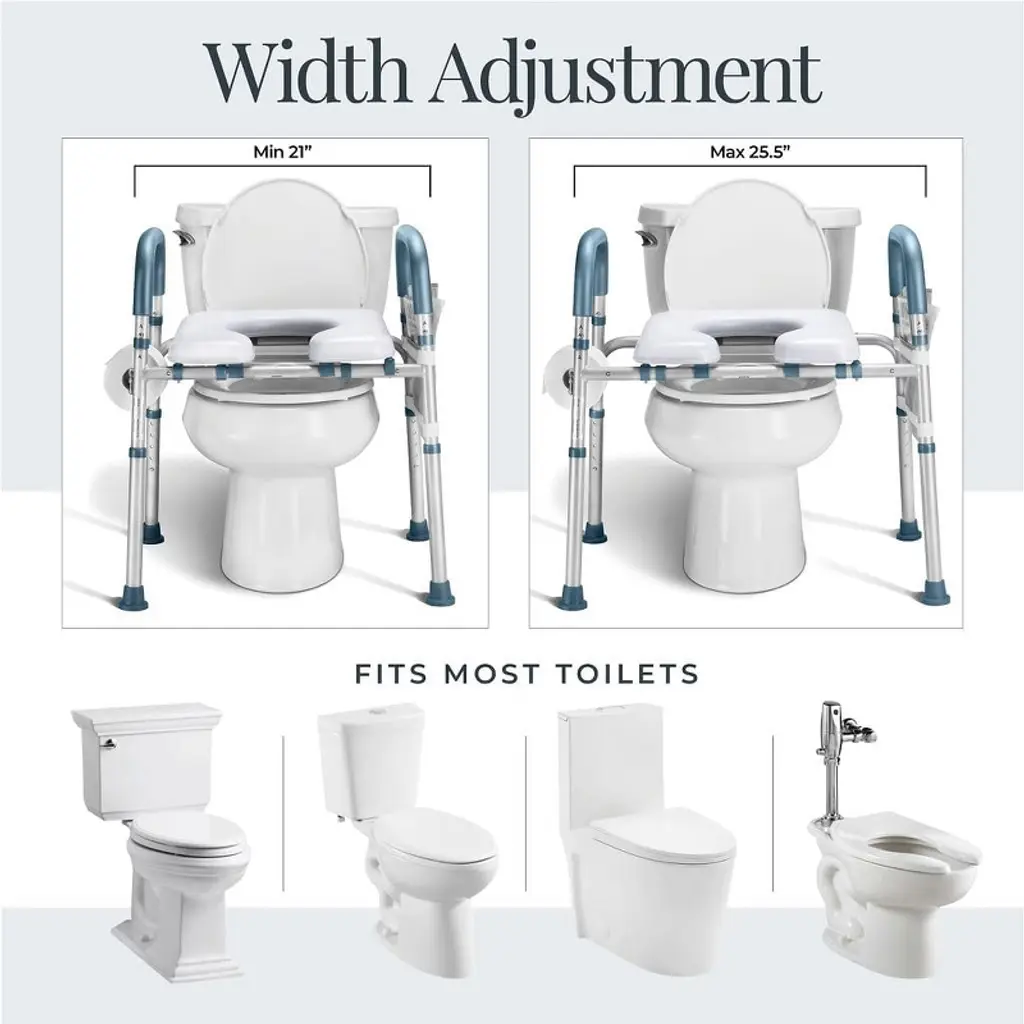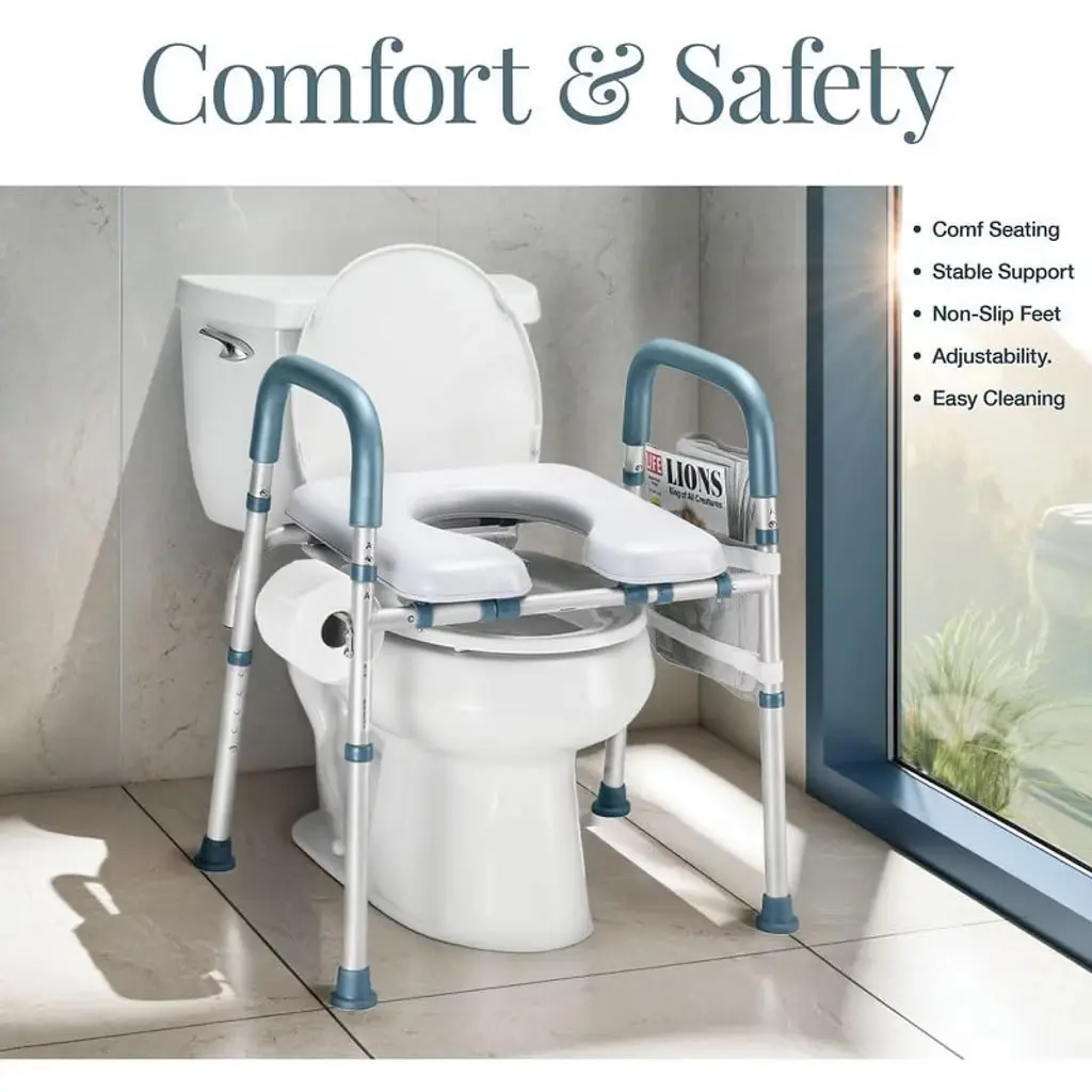 Designed for seniors, individuals with mobility challenges, and those recovering from surgery, this raised toilet seat offers enhanced comfort, stability, and ease of use. Featuring adjustable width and height, it fits most standard toilets and provides secure support for users up to 400 lbs. The soft, gray foam armrests offer a comfortable and stable grip, reducing strain when sitting or standing. Non-slip rubber feet on the adjustable supporting legs enhance security by preventing movement. The padded, non-absorbent seat ensures long-lasting comfort, making extended sitting easier. For added convenience, the foldable design allows for quick portability and storage, with a simple 2-minute assembly and disassembly process. The extra-large seat (16.5 inches) provides superior comfort and support, making it an essential aid for elderly, disabled, and pregnant individuals.