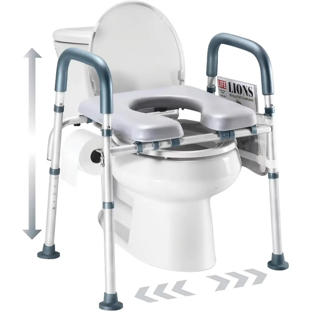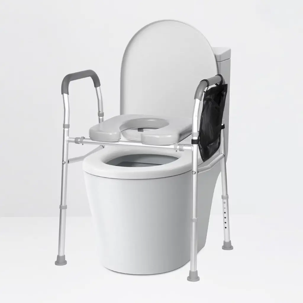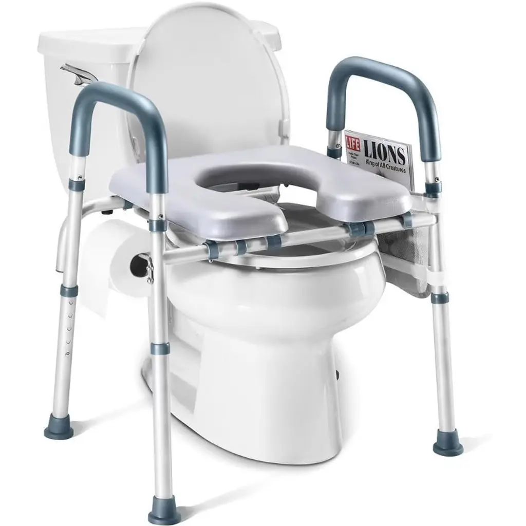 Designed for seniors, individuals with mobility challenges, and those recovering from surgery, this raised toilet seat offers enhanced comfort, stability, and ease of use. Featuring adjustable width and height, it fits most standard toilets and provides secure support for users up to 400 lbs. The soft, gray foam armrests offer a comfortable and stable grip, reducing strain when sitting or standing. Non-slip rubber feet on the adjustable supporting legs enhance security by preventing movement. The padded, non-absorbent seat ensures long-lasting comfort, making extended sitting easier. For added convenience, the foldable design allows for quick portability and storage, with a simple 2-minute assembly and disassembly process. The extra-large seat (16.5 inches) provides superior comfort and support, making it an essential aid for elderly, disabled, and pregnant individuals.