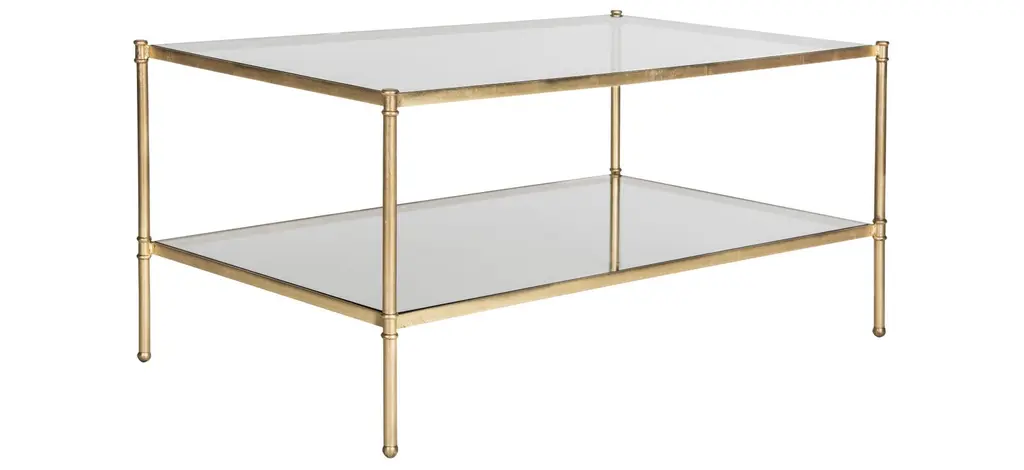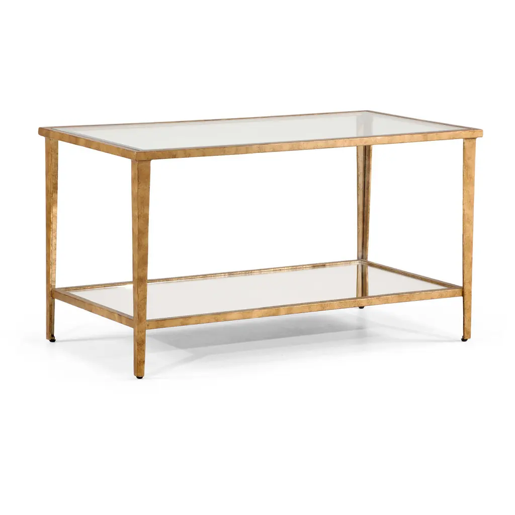 A refined design that embraces both classic and transitional styling, this two tiered Adkin Coffee Table provides ample space for collectibles, drinks, and hors d'oeuvres. Crafted of glass and iron with antique gold leaf finish for elegant interiors.
