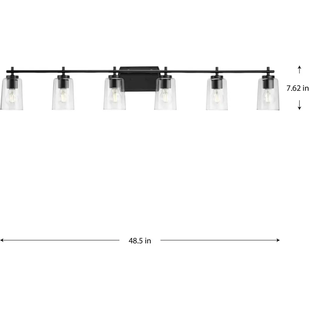Fundamentally modern but with a traditional twist, the Adley six-light combines simple, clear glass shades with a curved edge backplate. A matte black, curved backplate and simple, straight bar hold classic, clear glass shades, making it an excellent choice for new traditional and transitional settings.