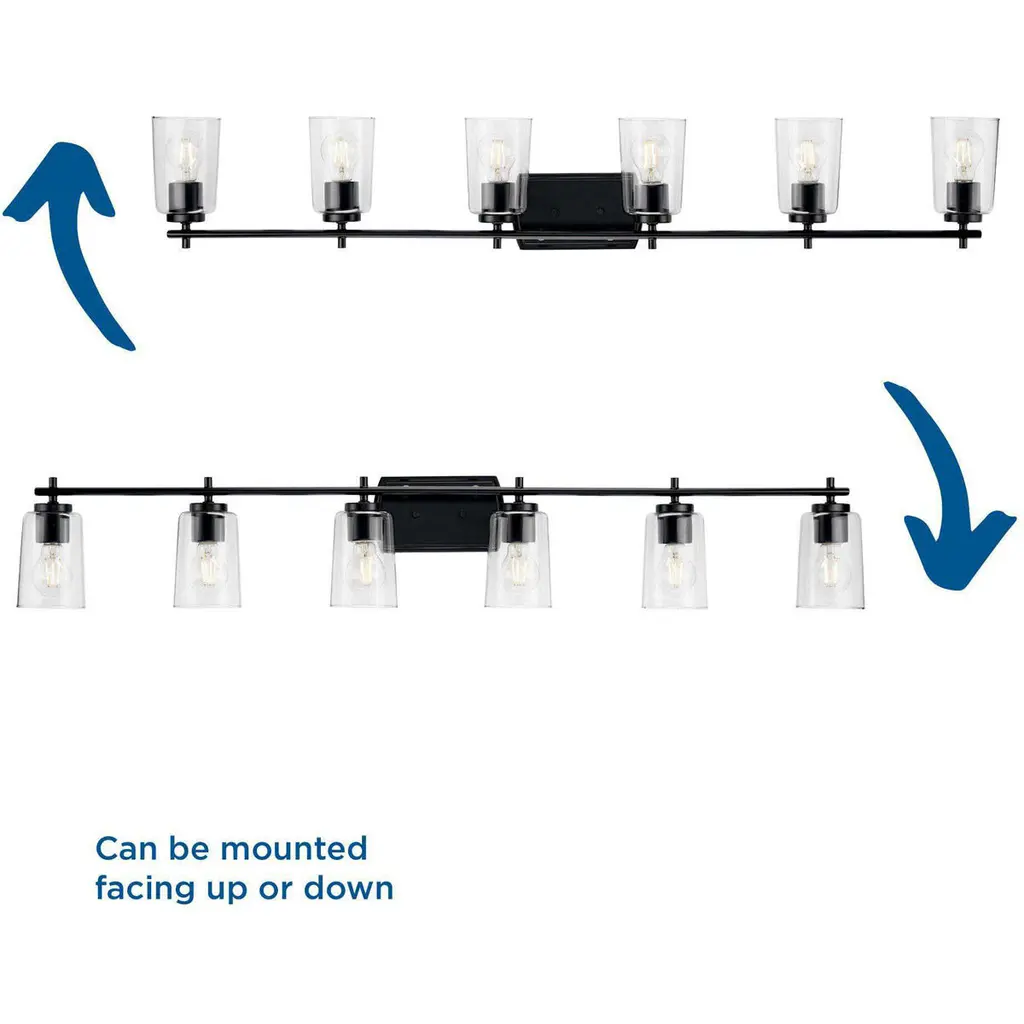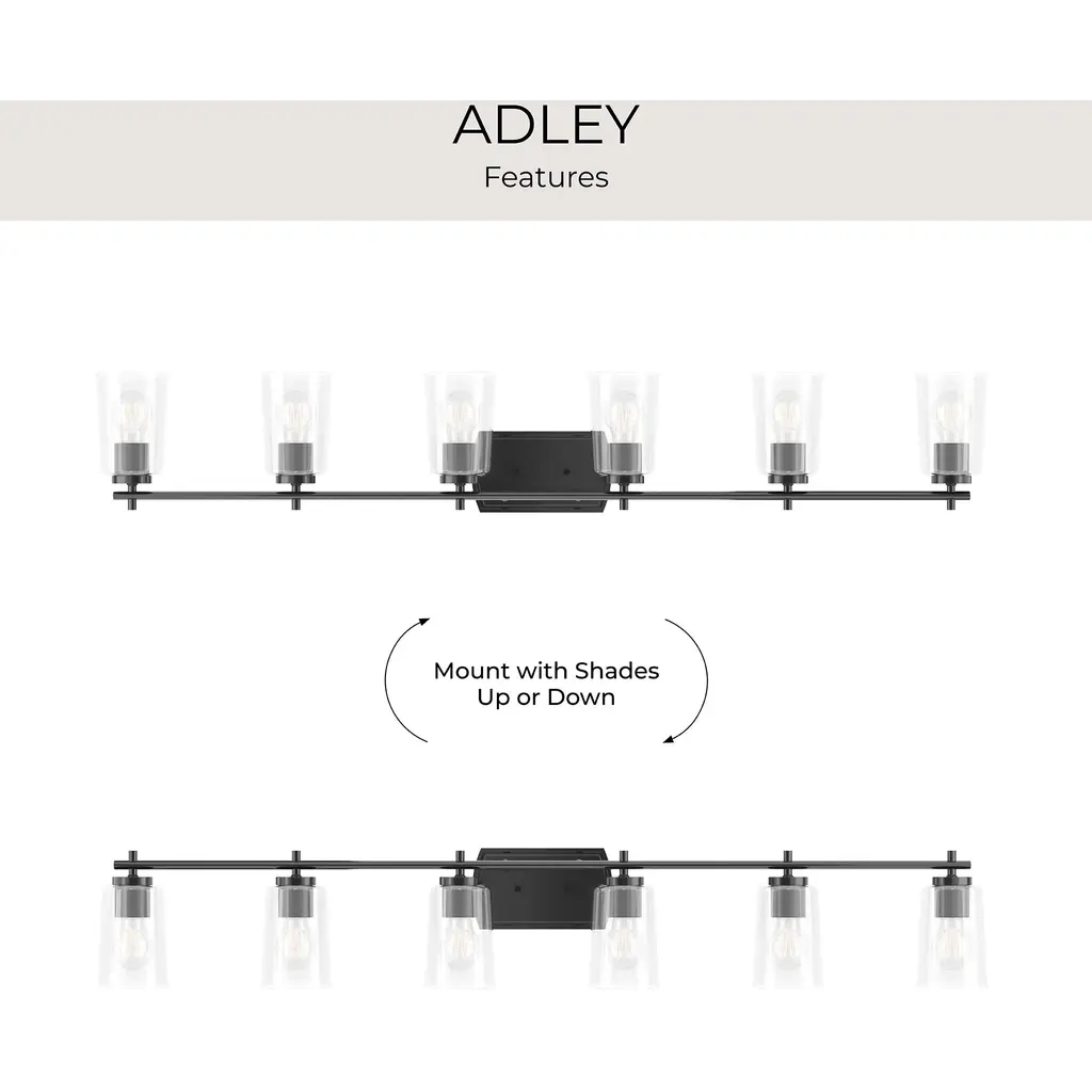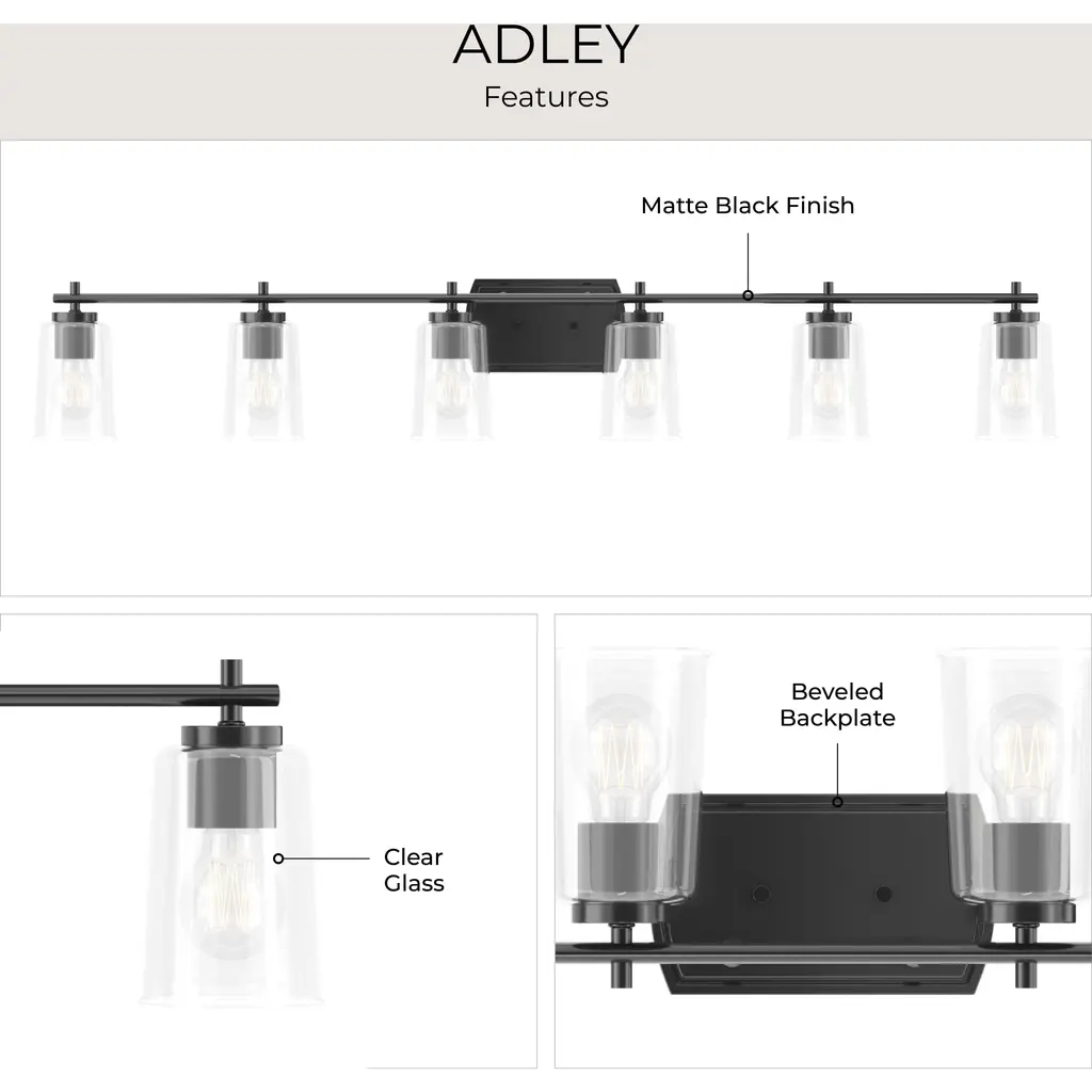 Fundamentally modern but with a traditional twist, the Adley six-light combines simple, clear glass shades with a curved edge backplate. A matte black, curved backplate and simple, straight bar hold classic, clear glass shades, making it an excellent choice for new traditional and transitional settings.