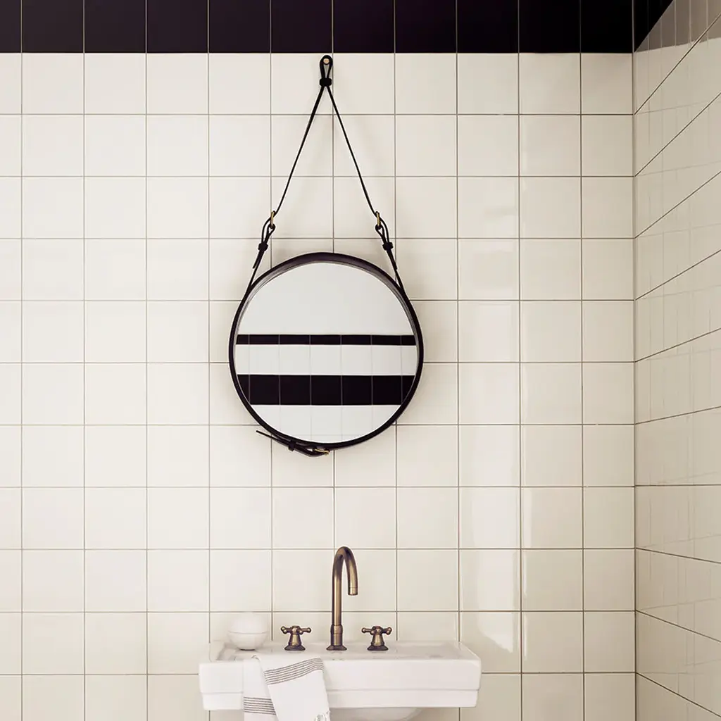 In 1950, Jacques Adnet formed a partnership with a famous French fashion house, where he developed a collection of discreet yet voluptuous leather-covered furniture and interior accessories. Known for being an innovative thinker, Adnet was one of the first designers to combine leather with glass. Accordingly, he designed the elegant, distinctive round leather mirror with equestrian inspired detailing - the Adnet Circulaire Mirror. Besides the remarkable leather and burnished brass details, the mirror in three sizes is also unique as the strap holding the mirror is in direct proportion to the dimension of it. The timeless Adnet Circulaire Mirror adds a sculptural value to any hallway, bathroom or living room and the three sizes can advantageously be combined to create an outstanding expression. Available in with buckles in burnished brass.