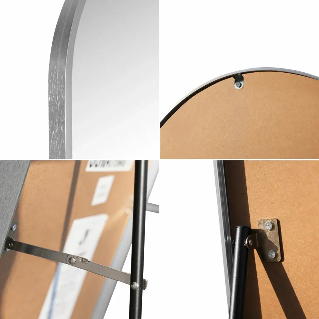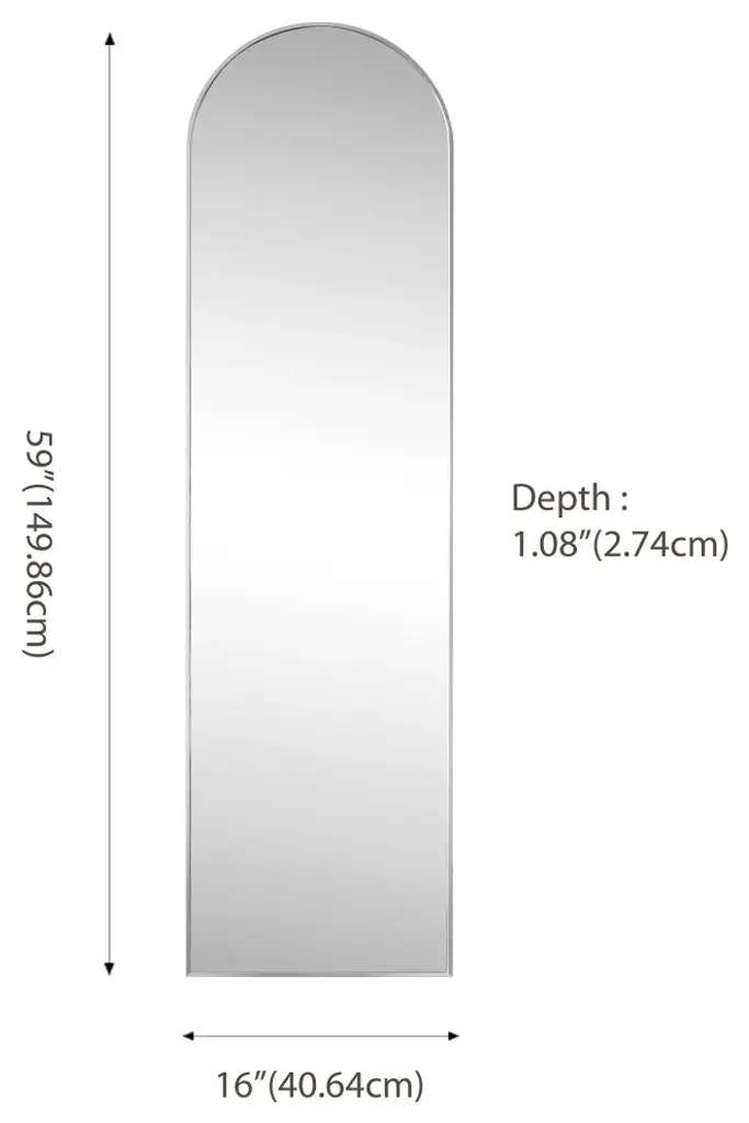 This sleek, modern dressing mirror has a classic arched top that adds a vintage vibe to any space. The freestanding design is strengthened by a narrow metal frame and easel leg. Its vertical orientation is ideal for the closet, bedroom or dressing area.Features:• Mirrored glass has a minimalist nickel metal frame• Contemporary 16" wide design fits easily into a corner• Add a touch of glam to a bedroom or bathroom with the sleek curves of this versatile mirror• MDF backboard• with • Mirror Orientation: Vertical• Body Material: Metal• 59 inches high x 16 inches wide x 1.08 inches deepAbout us:You see an ordinary mirror.We see an enhancement to help with making your fashionable statement.A perfectly smooth-edged frame with LED lighting and uniform surface casts a flaring reflection of the subject and surroundings. Our vast mirror catalog includes a variety of designs, shapes and sizes.JONATHAN Y Lighting - a fashion revolution in home decor.