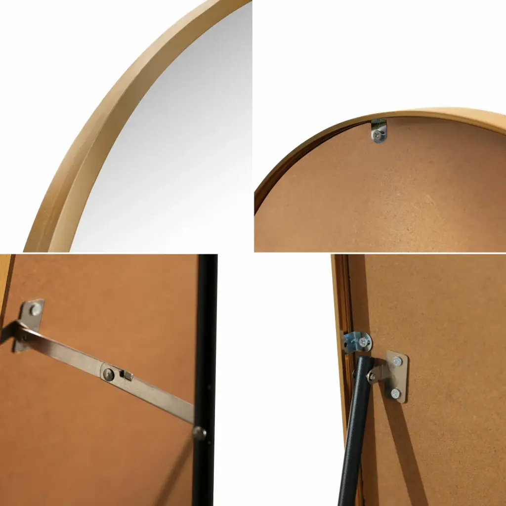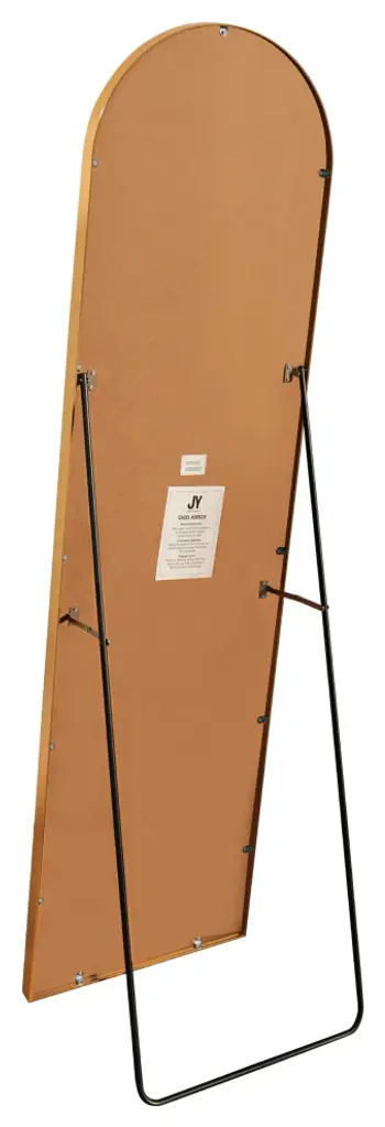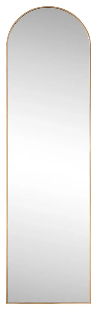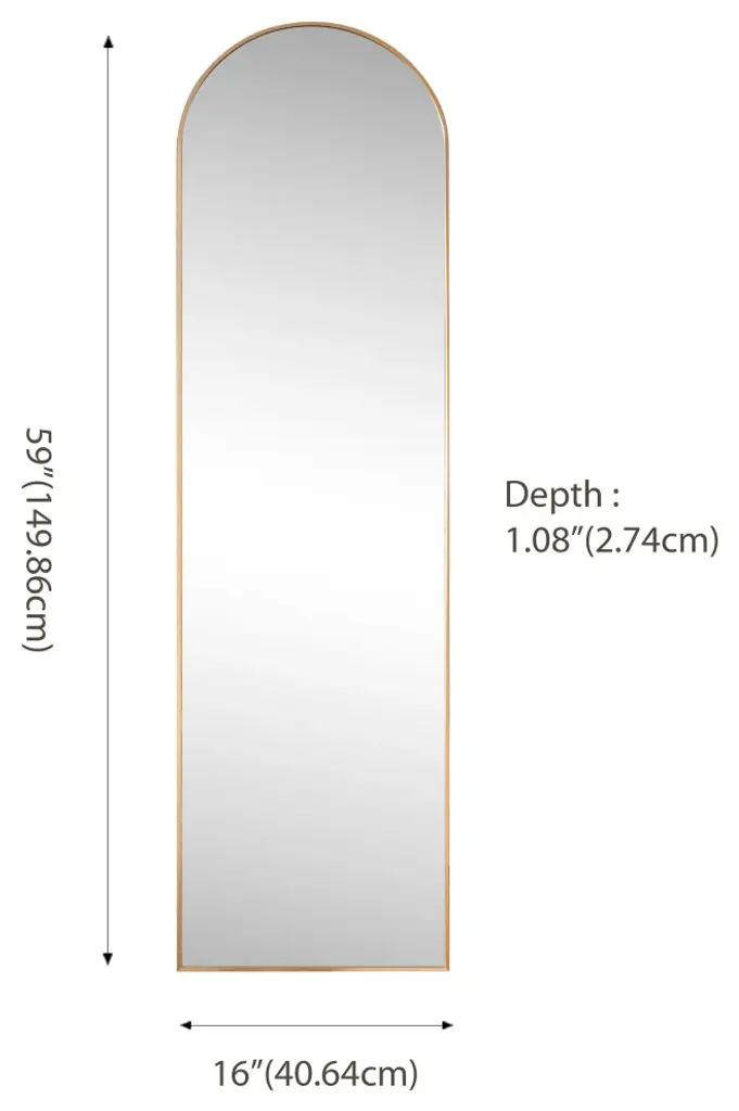 This sleek, modern dressing mirror has a classic arched top that adds a vintage vibe to any space. The freestanding design is strengthened by a narrow metal frame and easel leg. Its vertical orientation is ideal for the closet, bedroom or dressing area.Features:• Mirrored glass has a minimalist gold metal frame• Contemporary 16" wide design fits easily into a corner• Add a touch of glam to a bedroom or bathroom with the sleek curves of this versatile mirror• MDF backboard• with • Mirror Orientation: Vertical• Body Material: Metal• 59 inches high x 16 inches wide x 1.08 inches deepAbout us:You see an ordinary mirror.We see an enhancement to help with making your fashionable statement.A perfectly smooth-edged frame with LED lighting and uniform surface casts a flaring reflection of the subject and surroundings. Our vast mirror catalog includes a variety of designs, shapes and sizes.JONATHAN Y Lighting - a fashion revolution in home decor.