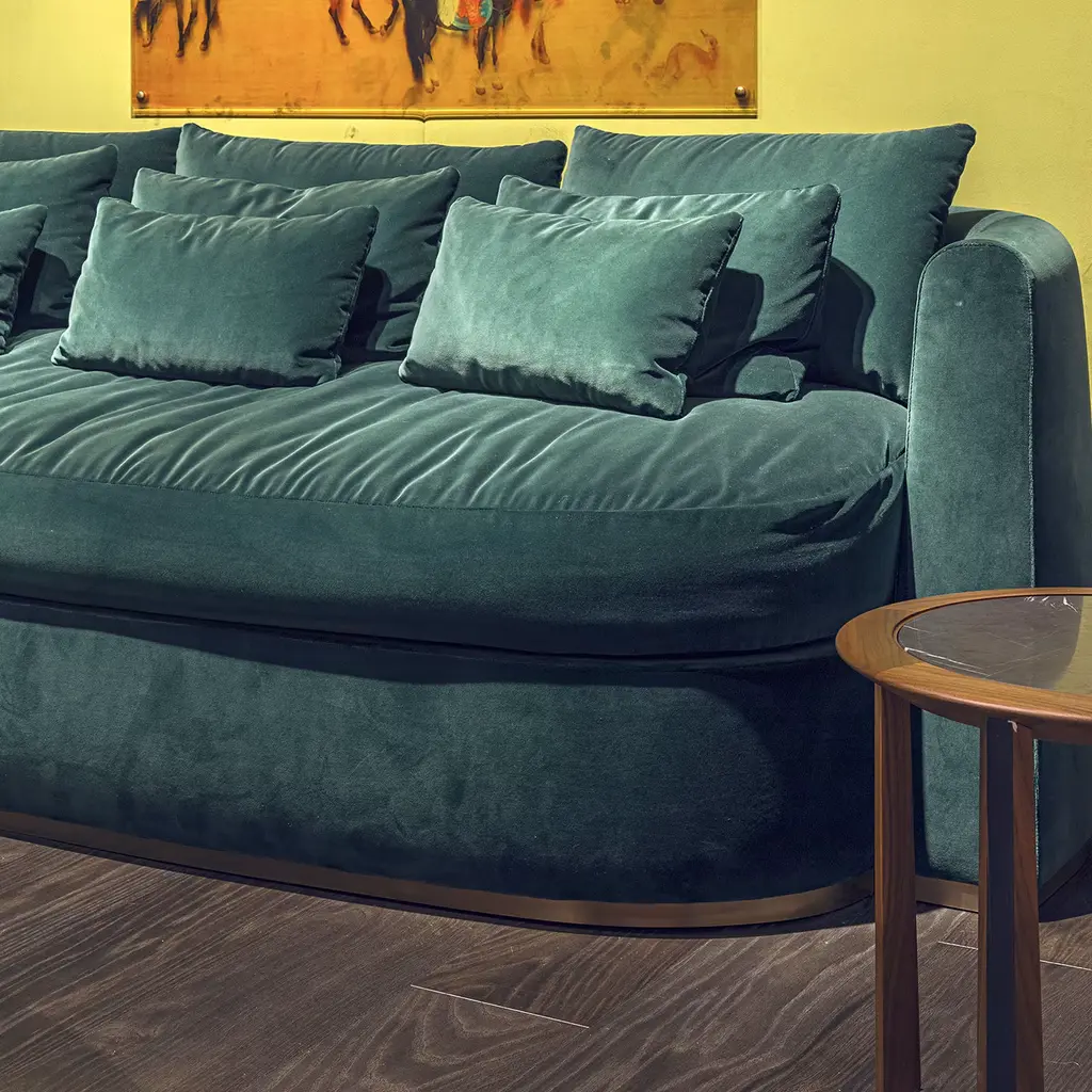 The aesthetic value defining this superb sofa will infuse any modern decor with unparalleled sophistication. A deeply curved structure tightly embraces the wide oval seat offering the right amount of support for the back and arms. The generously padded seat provides utmost comfort, making this wooden design fully upholstered in emerald fabric a charming place where to relax. A bronze base subtly complements the piece.