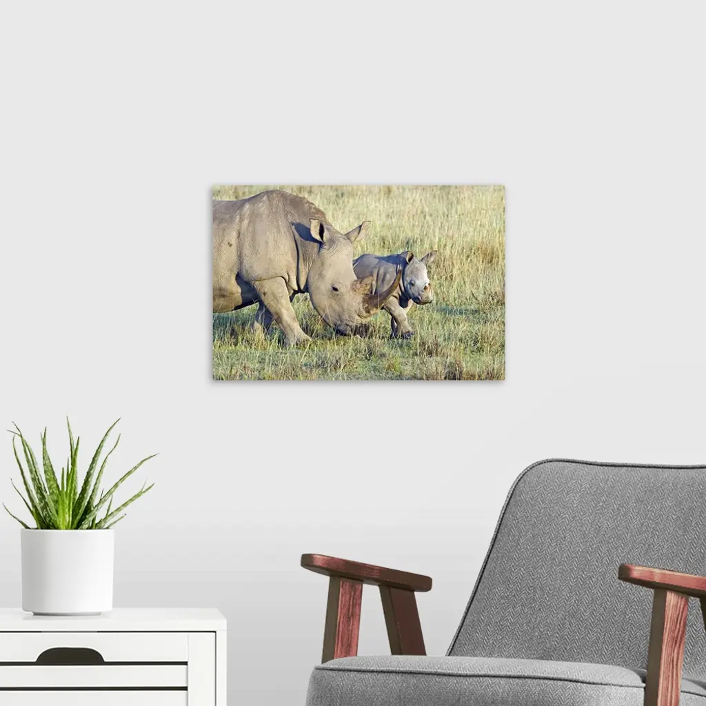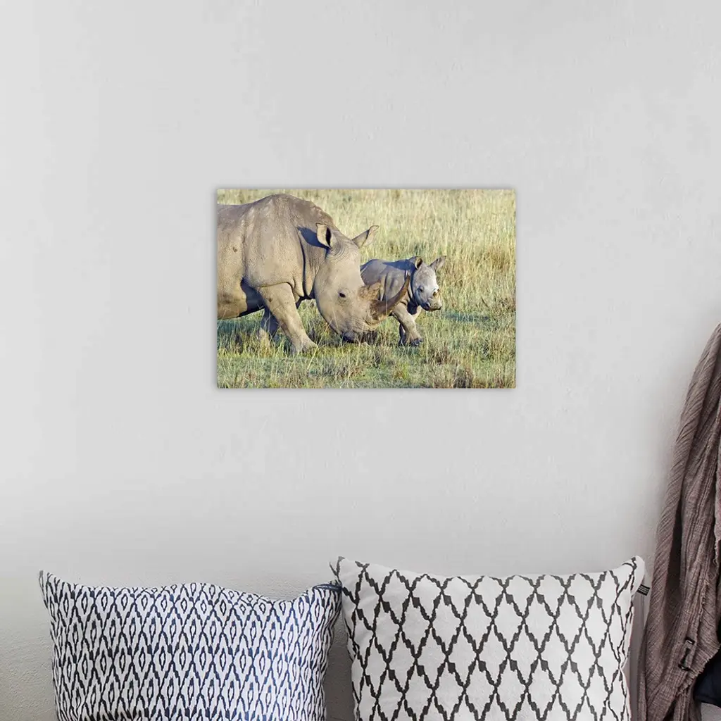 Adult White Rhinoceros (Ceratotherium Simum) walking with its calf, Lake Nakuru, Kenya wall art for home and office decor. Discover canvas art prints, photos, mural, big canvas art and framed wall art in GreatBigCanvas.com's varied collections.