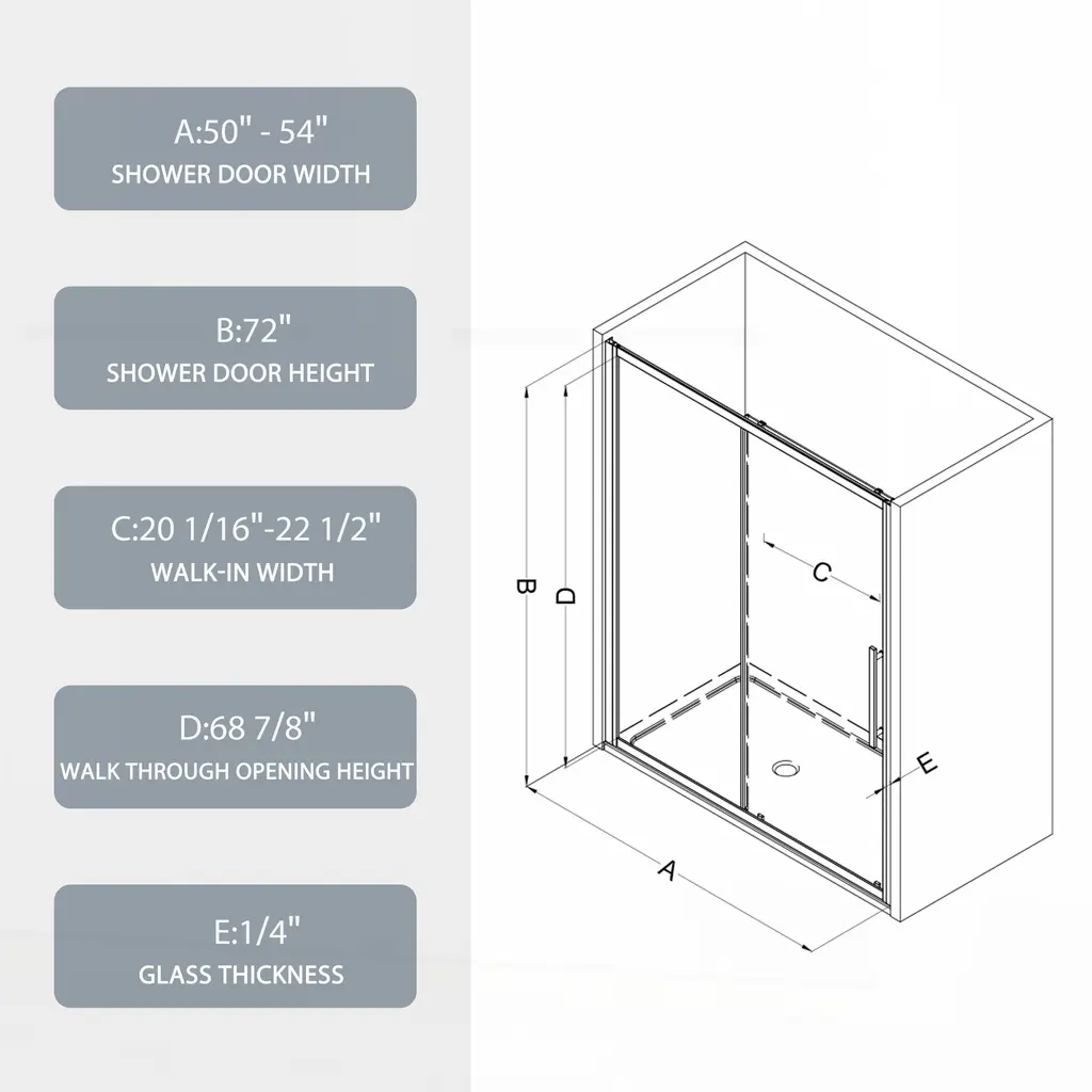 Product FeaturesDescriptionThis bathtub sliding shower door is a perfect addition to your bathroom. It can open either to the left or the right, providing flexibility. The width ranges from 50" to 54", and the height is a generous 72", making it suitable for most standard bathtubs.Constructed with 1/4" tempered glass, it combines strength and style. The 1 9/16" wall - adjustable channel allows for a custom - fit installation. The easy - install system means you don't need to be a professional to set it up.The nano easy - clean glass with the protective film ensures long - lasting performance and easy maintenance. The stainless steel handle is not only functional but also aesthetically pleasing. Thanks to its left - and - right universal design, you can install it exactly as you need. The magnetic close and excellent anti - leakage design make it a reliable and practical choice for your daily shower routine.