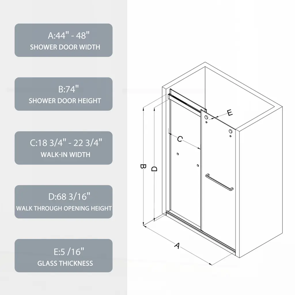 Product FeaturesProduct DescriptionOur BYPASS SHOWER DOOR with a soft close system offers the flexibility of left or right opening. It has a width of 48" and a height of 74", providing a spacious and comfortable showering area.Glass Quality: The 5/16" tempered glass is not only strong but also treated for easy cleaning, ensuring a crystal - clear view and a hygienic shower environment.Stylish Handle: A 19.7" stainless steel handle adds a modern and elegant touch to the door, enhancing both its functionality and aesthetics.Easy Installation: Thanks to the easy - install system, you can set up this shower door without any hassle.Reliable Rollers: The stainless steel rollers are built to last, having passed 36,000 open - and - close tests. Coupled with the soft close system, they contribute to a smooth and quiet operation.Upgrade your bathroom today with our top - of - the - line bypass shower door!