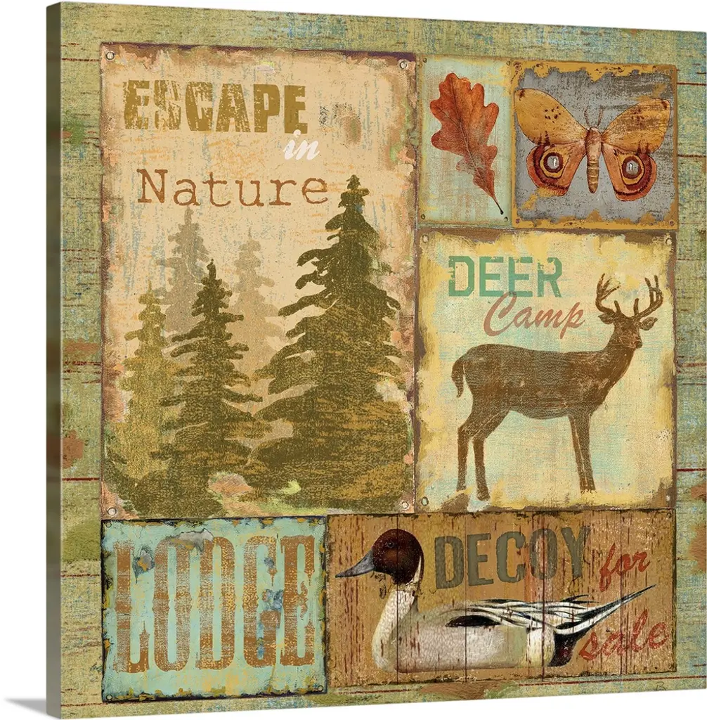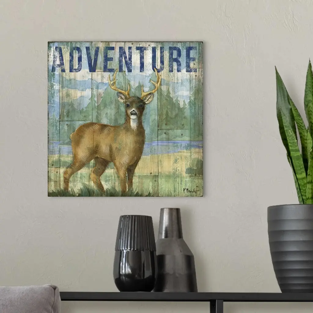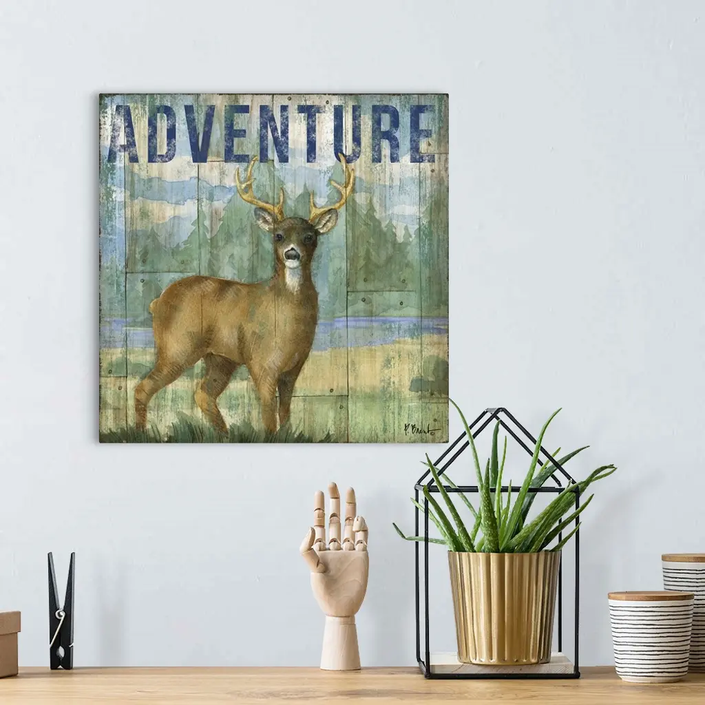Square cabin decor with a deer and wilderness painted on a faux wood background with "Adventure" written at the top in blue.