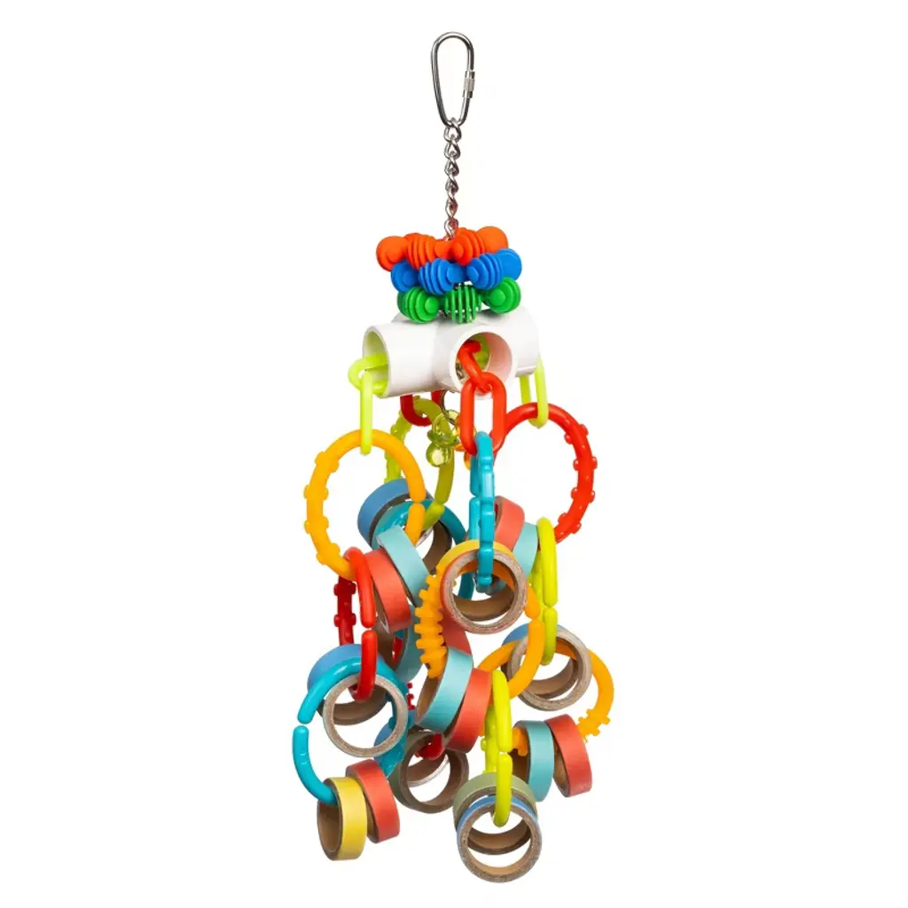 A&E Cage Company Happy Beaks Petite Learning Blocks Assorted Bird Toy has so many things to keep your favorite bird entertained. There are chains for climbing, blocks for beak conditioning, beads for playing with, a bell to make music. So many textures and colors to keep your birds attention and keep them entertained!Made in USAMultiple texturesBright colorsBlocks for beak conditioningGreat for small birds