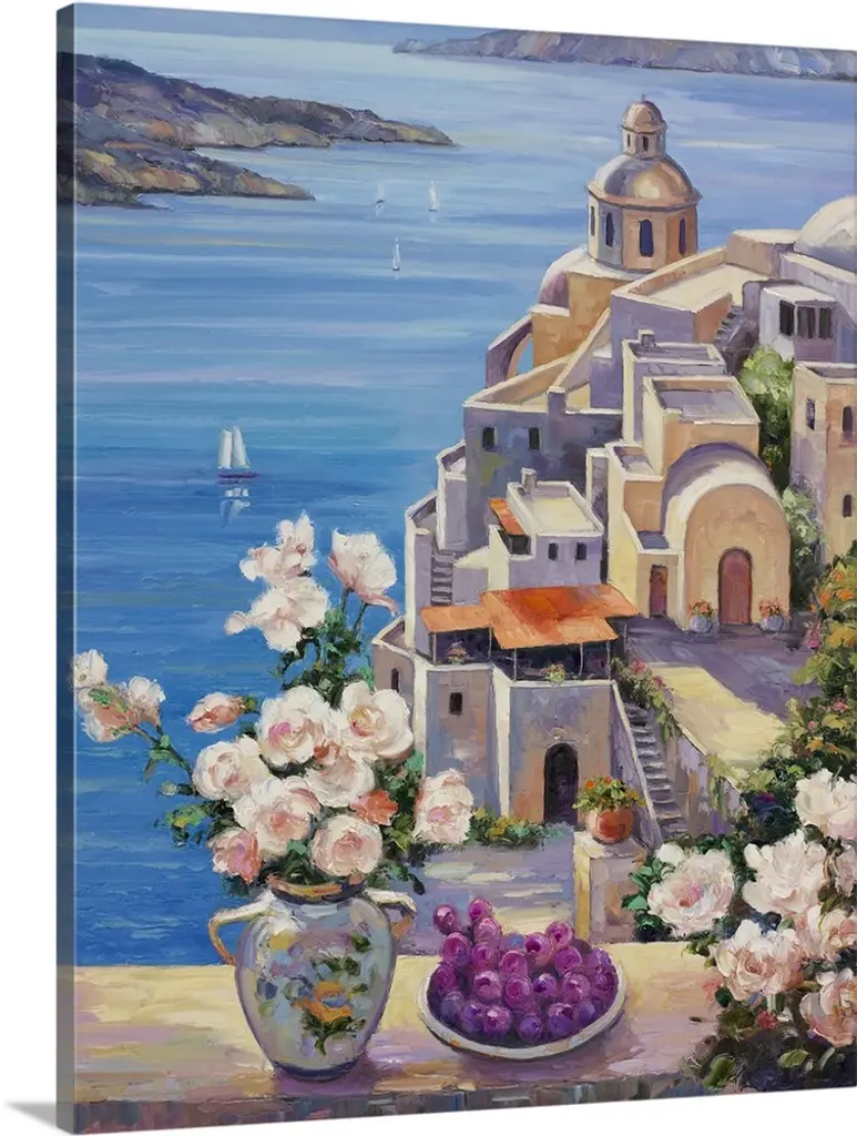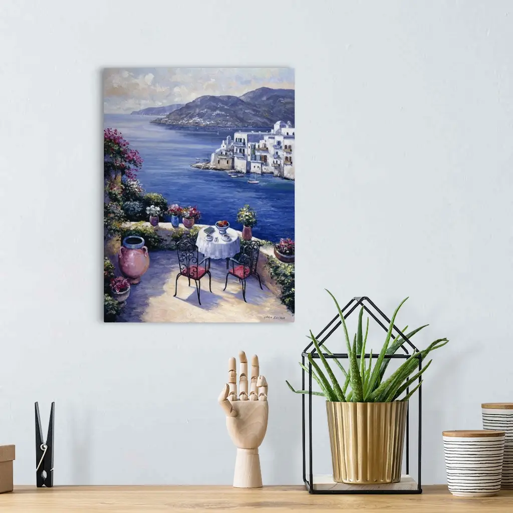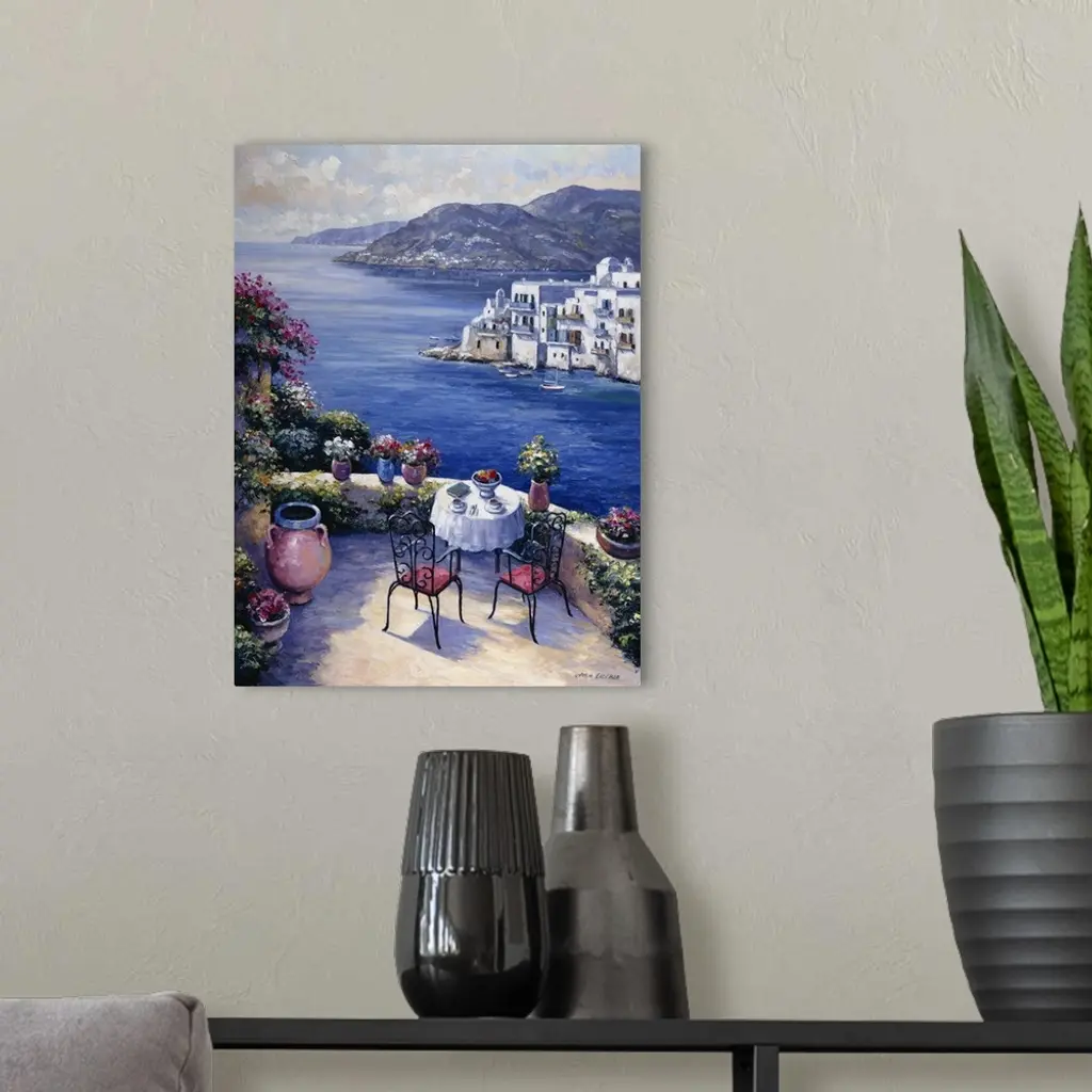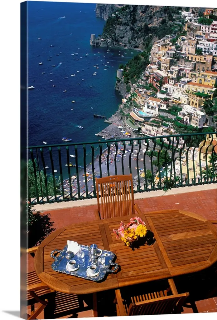 A patio table for two overlooking the ocean with a lot of flowers around.