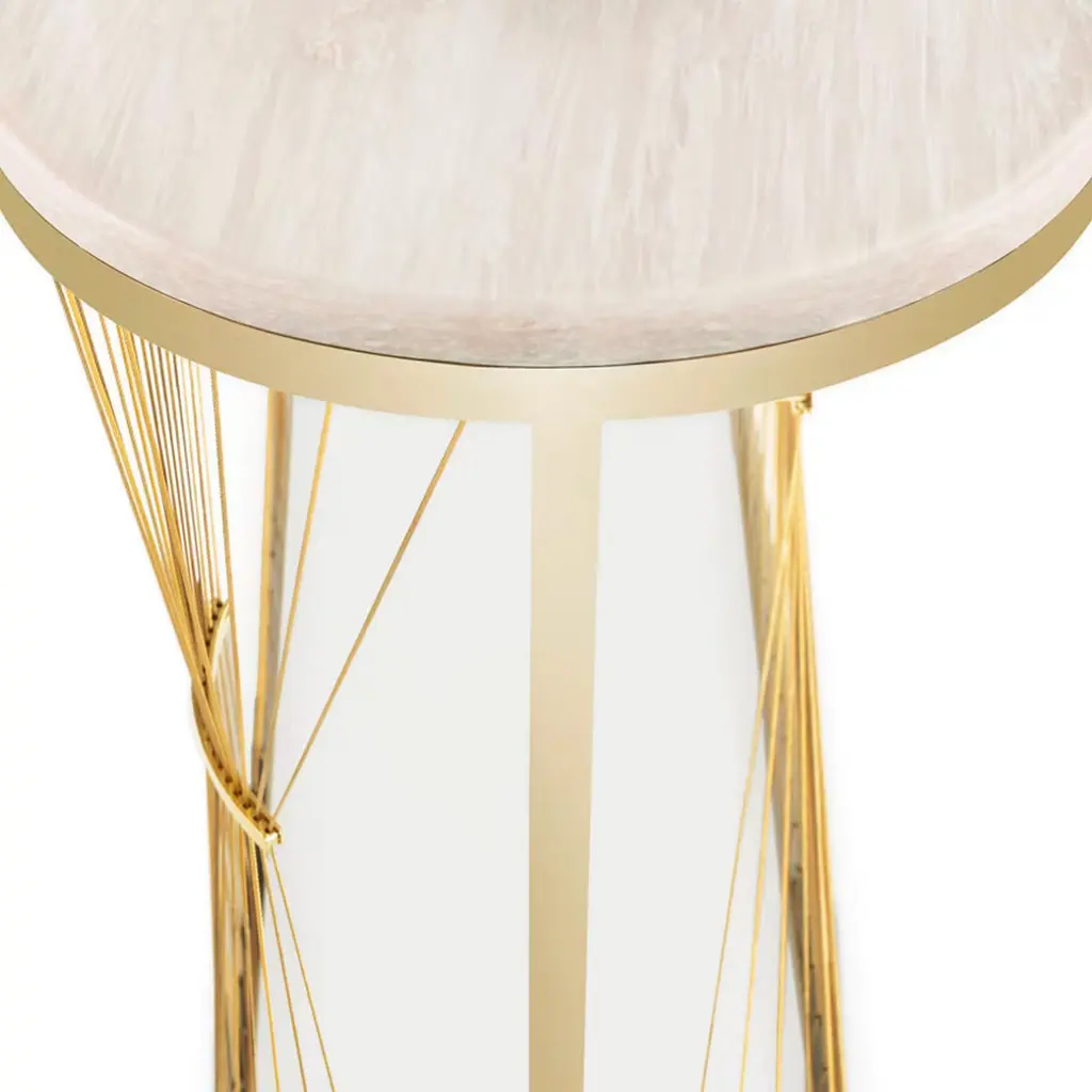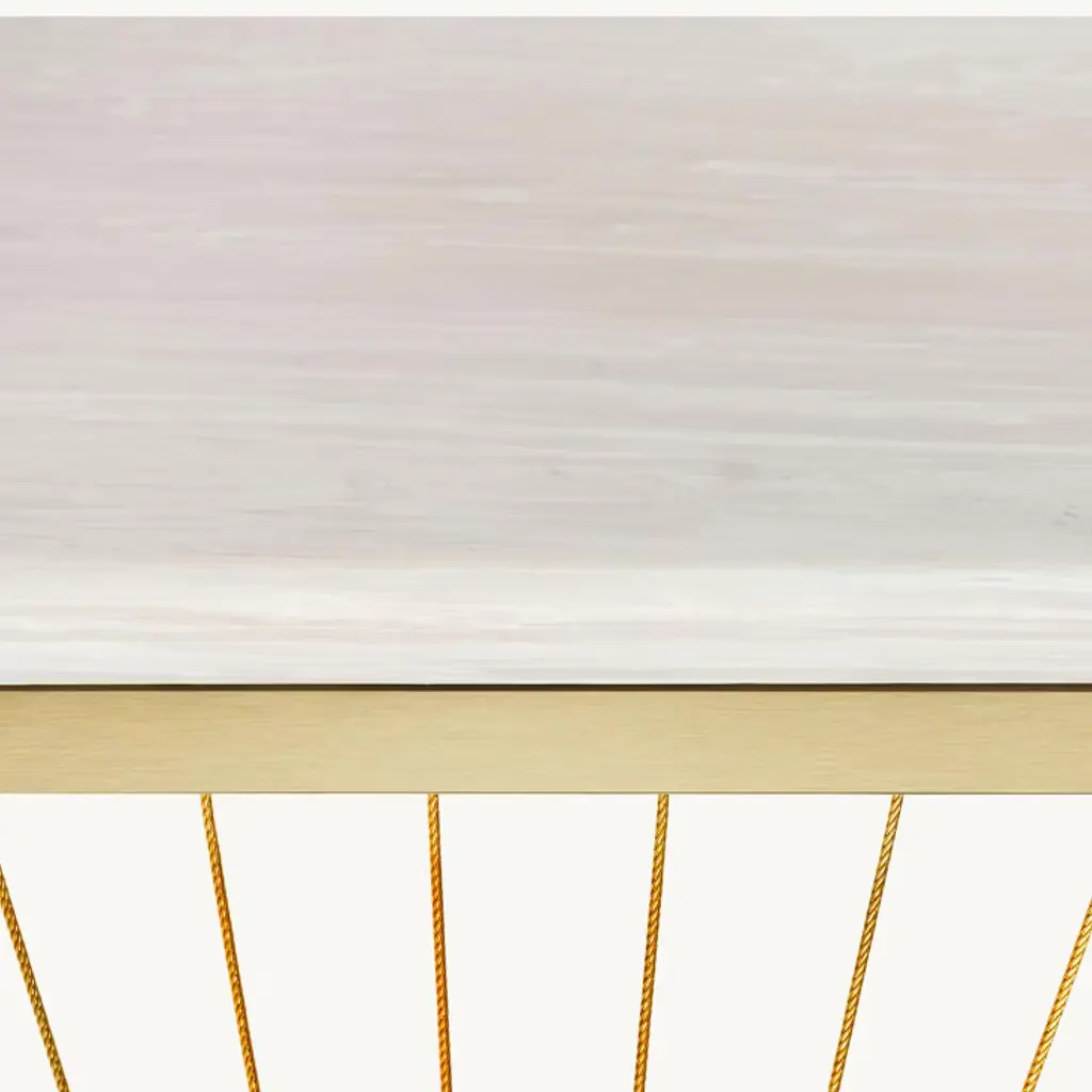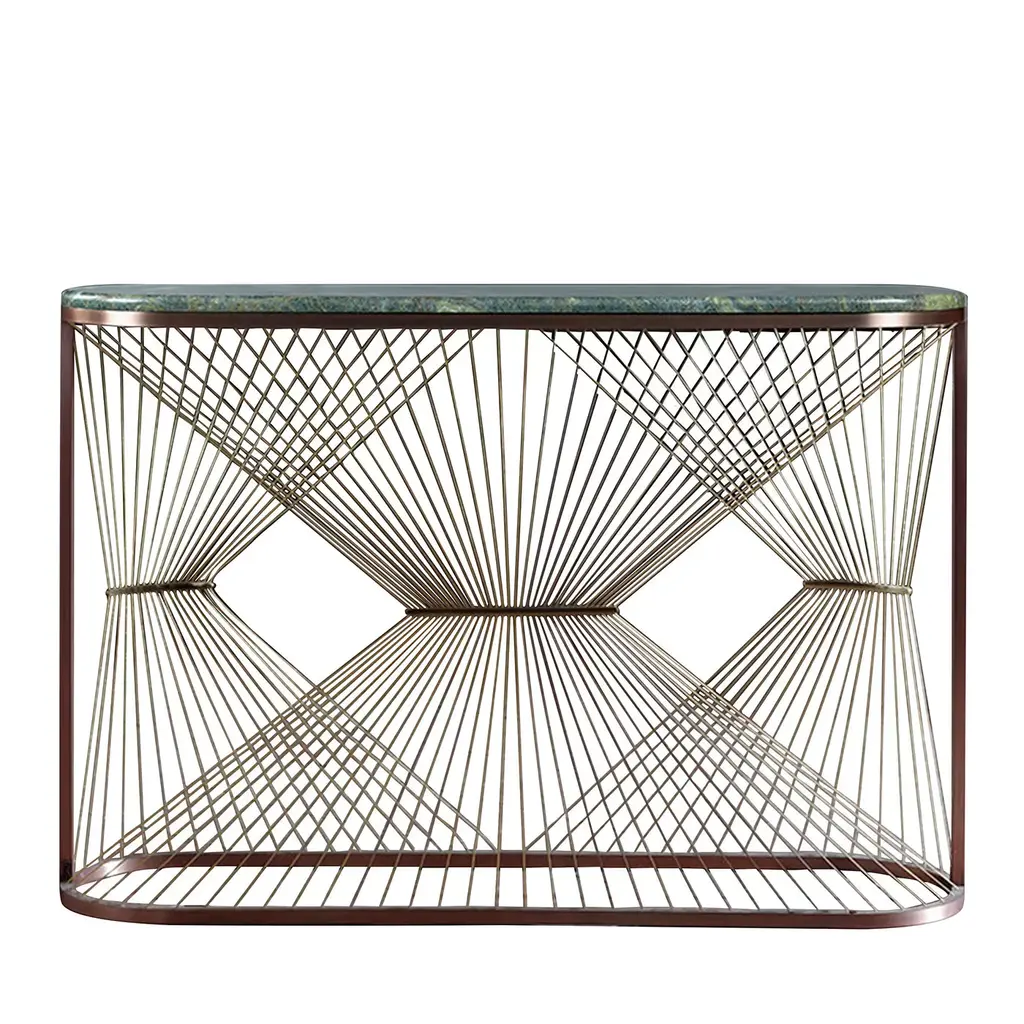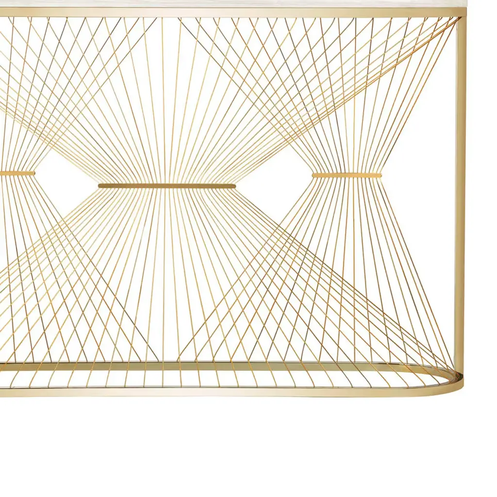 Stunning from all angles, this console by British designer Ziad Alonaizy features an oval top of Bianco-Rosa marble supported by a polished gold-finished stainless steel structure defined by artistic and arduous threading of gilded wires. The wires are joined together with polished brass plates resulting in hourglass shapes. Marked by impeccable quality and timeless elegance, this console is customizable in other finishes. Ask the Concierge for details.
