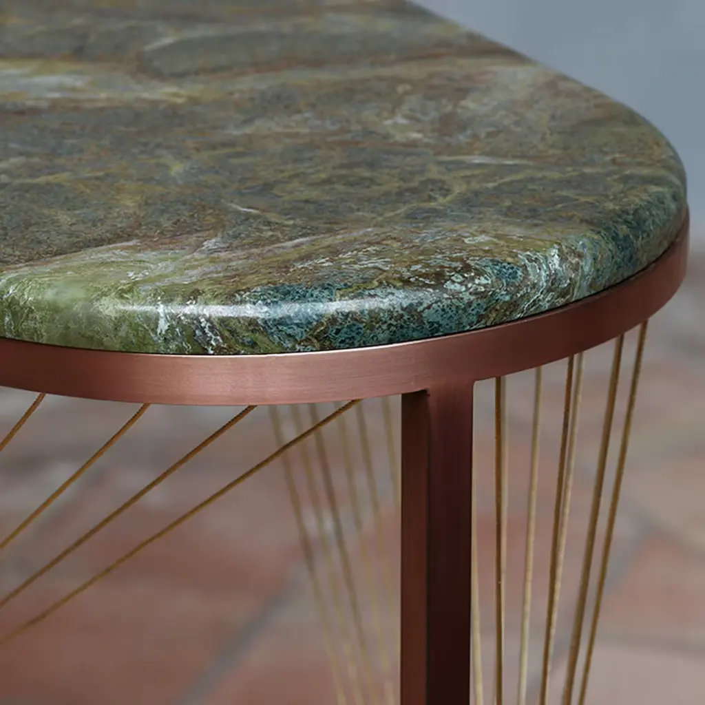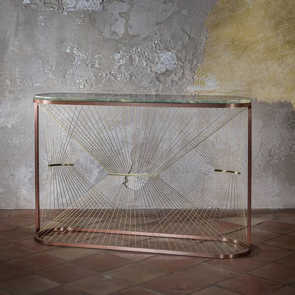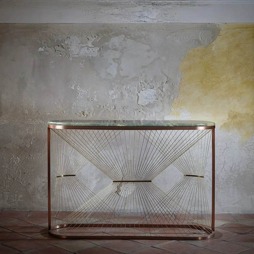Named after the Latin word for Zeus' invincible breastplate battle shield, the Aegis Collection is defined by balanced threading of wires joined to form a sumptuous hourglass shape. This elongated-oval console boasts a pink copper-plated iron structure enclosing the gold-plated wire design held elegantly by three strips of polished brass. This exclusive design is completed by a Golden Lighting marble top whose emerald green color with bright lime green accents brings together the chromatic gradients of this magnificent statement piece.