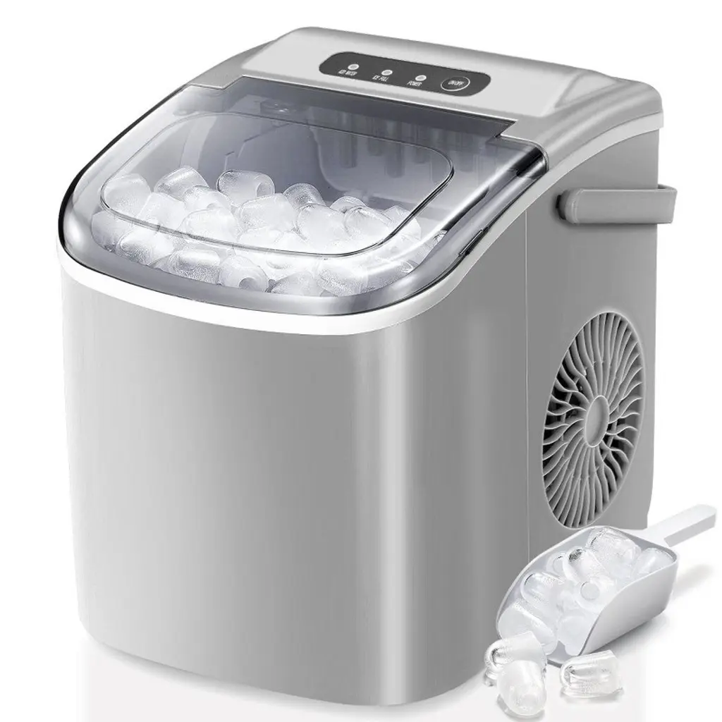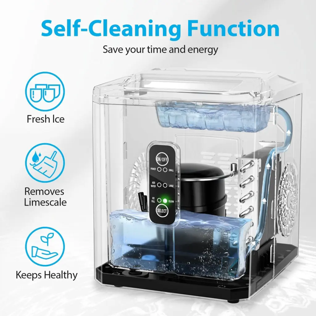 Aeitto's countertop ice maker delivers 9 cubes in just 6 minutes—perfect for parties, offices, or RVs. Choose two cube sizes: small for drinks, large for food preservation. Dual viewing windows let you monitor ice production and storage levels. The auto-clean function ensures hygienic operation with weekly maintenance. Compact and sleek, its space-saving design fits anywhere while adding modern elegance. Stay effortlessly cool with 26 lbs. of daily ice output!