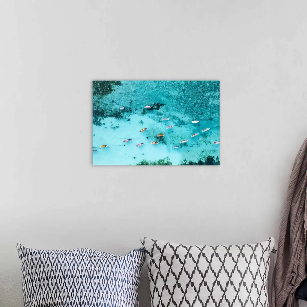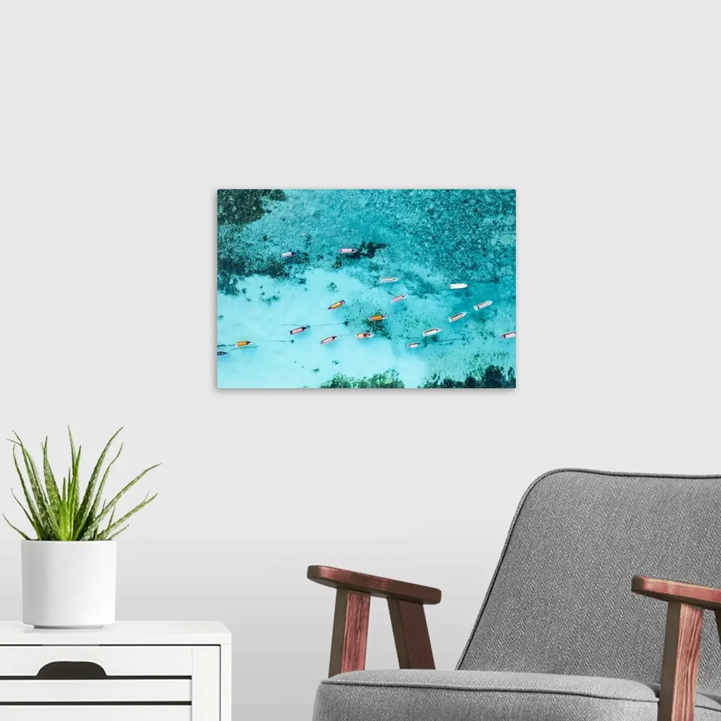 Aerial view of anchored boats in the exotic lagoon, Zanzibar, Tanzania, East Africa, Africa
