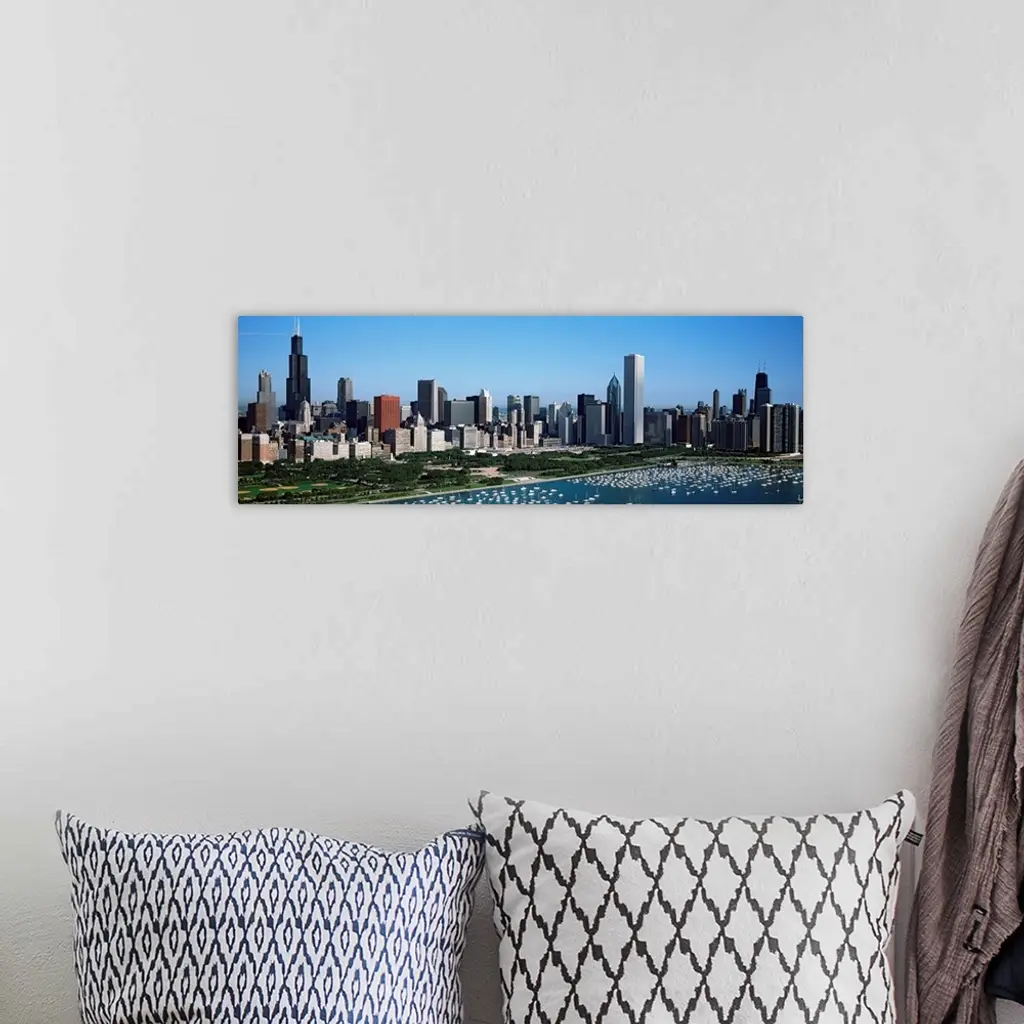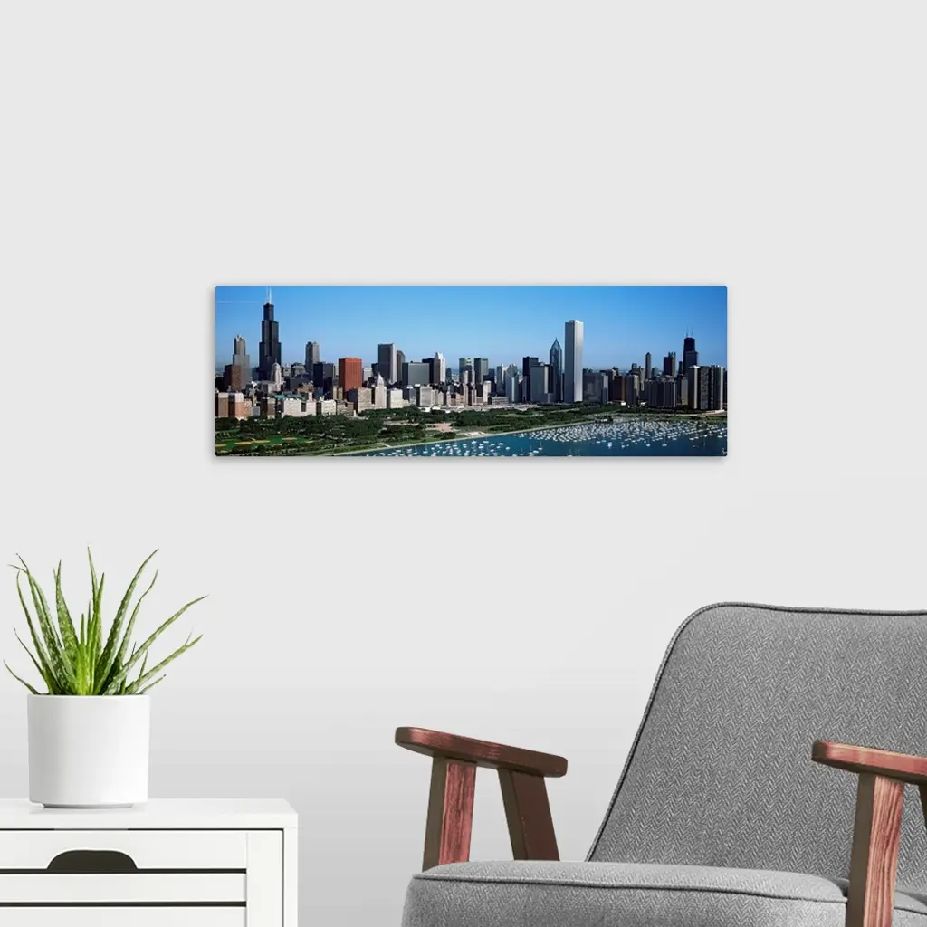 This panoramic photograph shows the city skyline and a crowded harbor on the lake on a sunny cloudless day.