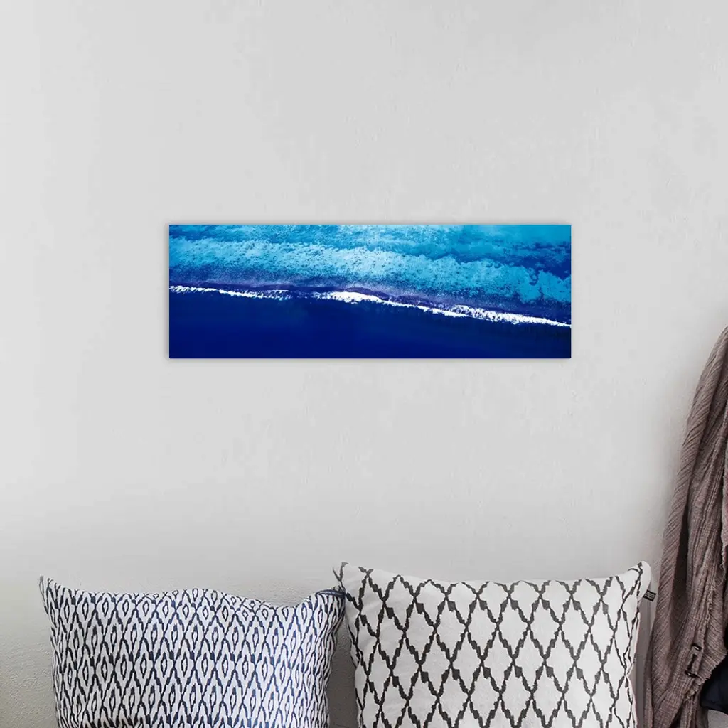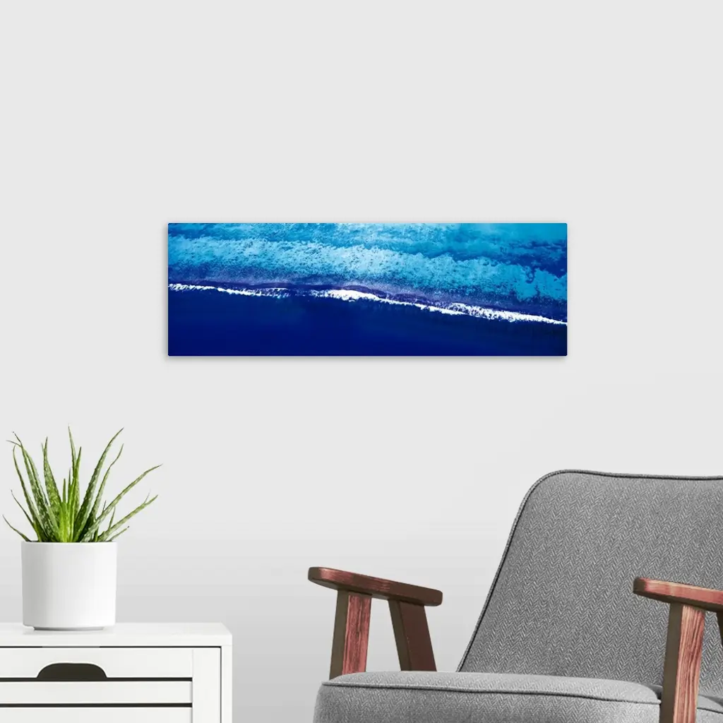 This is a panoramic photograph taken from above of waves breaking on the shore of this tropical reef.