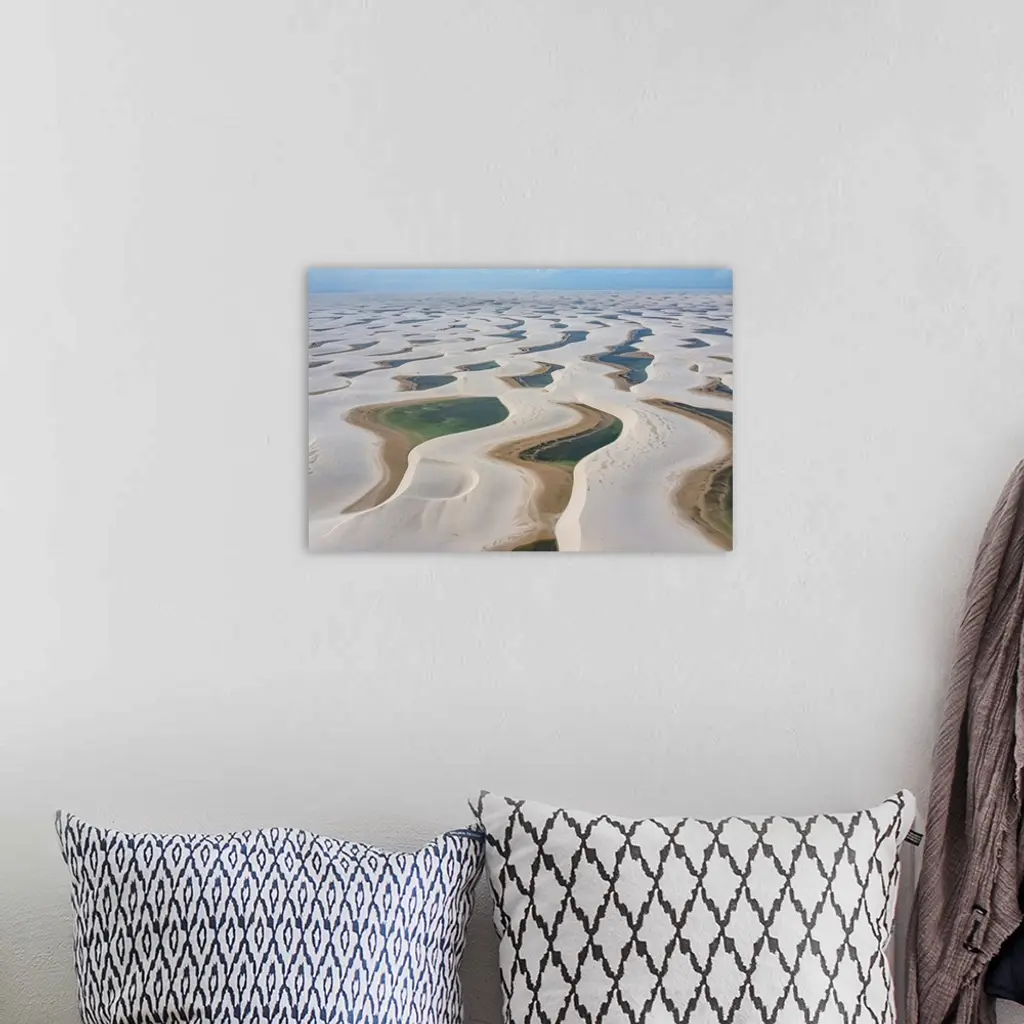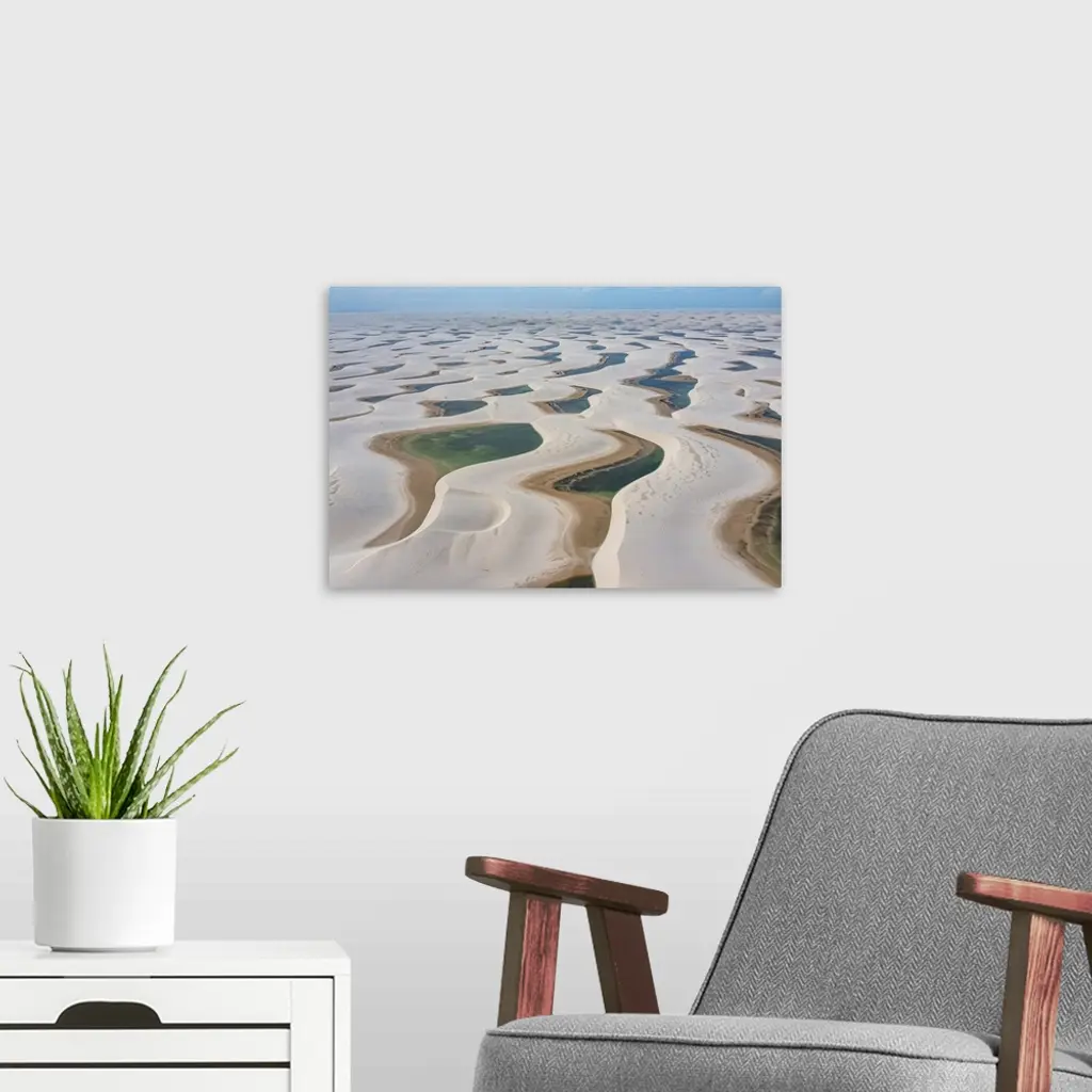 Aerial of freshwater lakes between huge sand dunes in the Lencois Maranhenses National Park, Maranhao, Brazil, South America