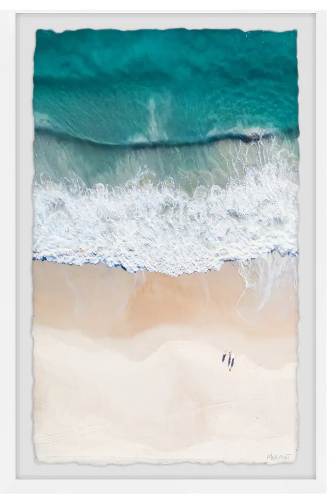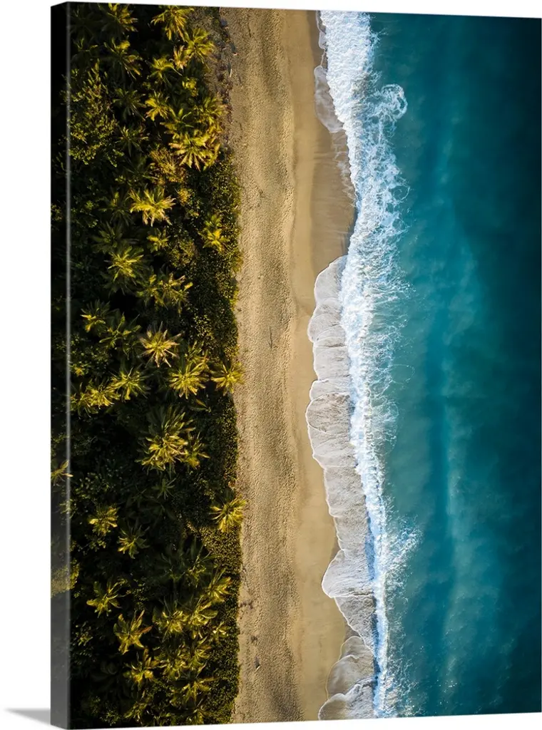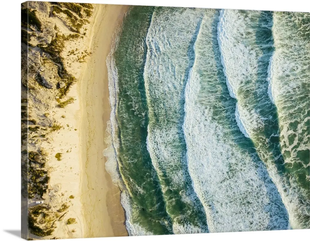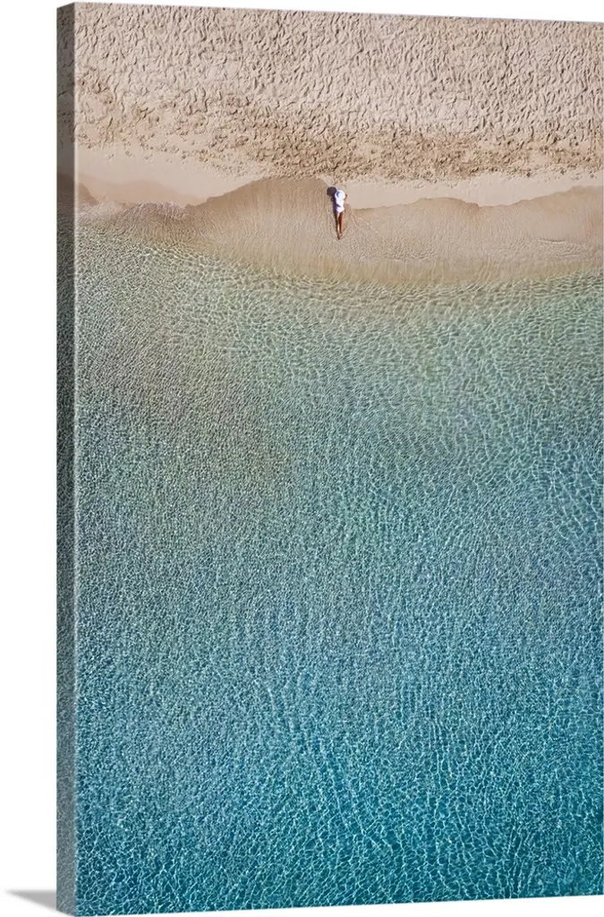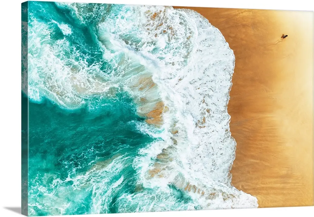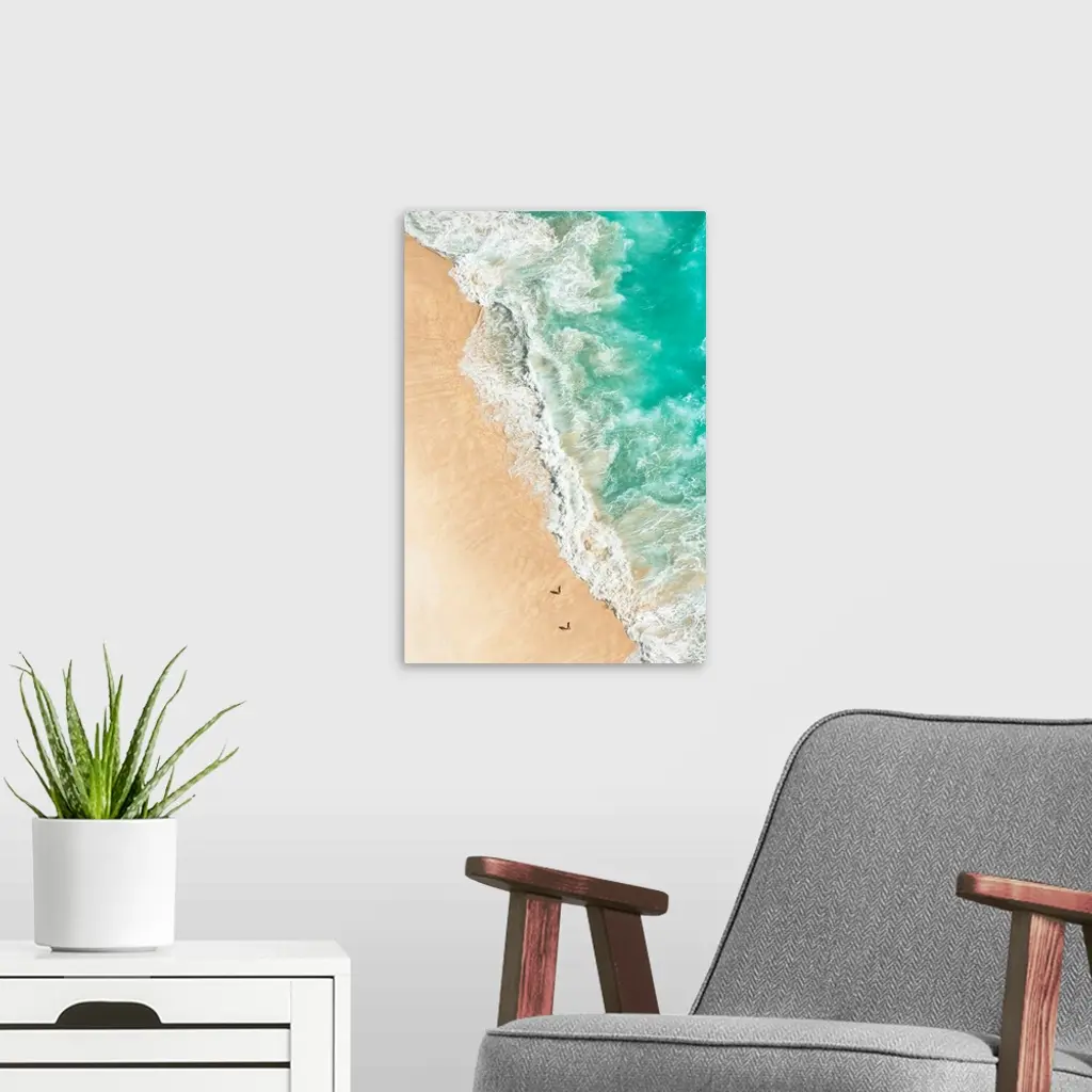 A stunning overhead aerial photograph of bright turquoise waves crashing onto a sandy beach wth two figures walking in the foreground