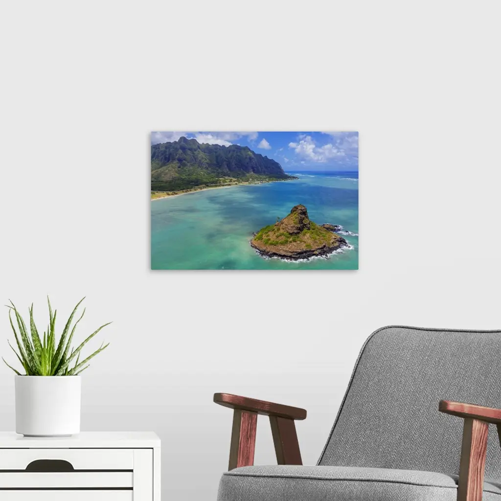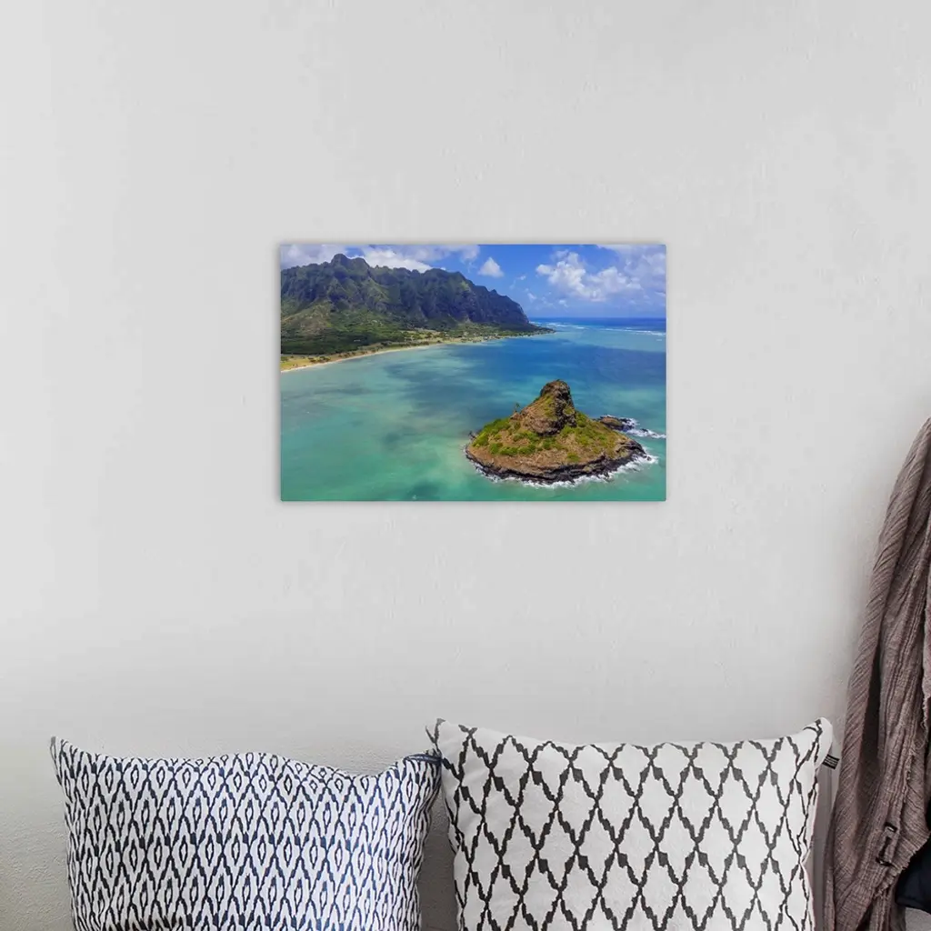 Aerial view by drone of Kaneohe Bay and Mokolii island (Chinaman's Hat), Oahu Island, Hawaii, United States of America, North America