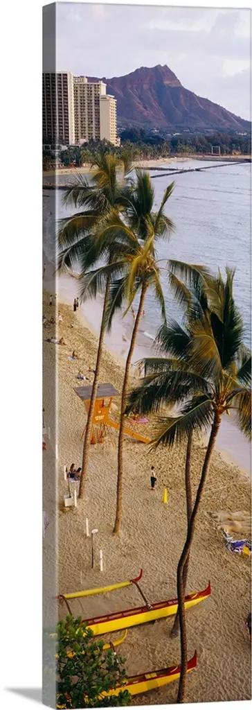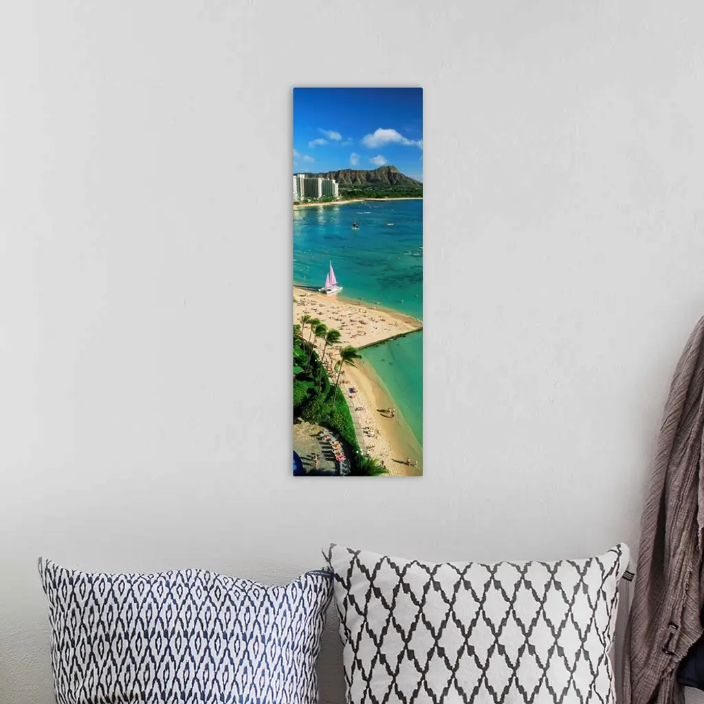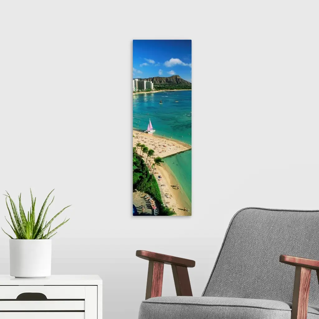 Aerial view of a beach, Diamond Head, Waikiki Beach, Oahu, Honolulu, Hawaii wall art for home and office decor. Discover canvas art prints, photos, mural, big canvas art and framed wall art in GreatBigCanvas.com's varied collections.