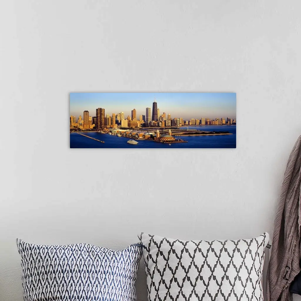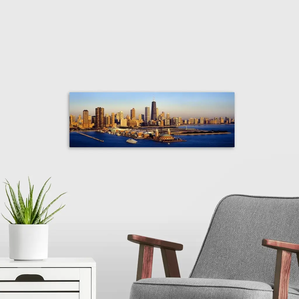 Aerial view of a city, Navy Pier, Lake Michigan, Chicago, Cook County, Illinois wall art for home and office decor. Discover canvas art prints, photos, mural, big canvas art and framed wall art in GreatBigCanvas.com's varied collections.