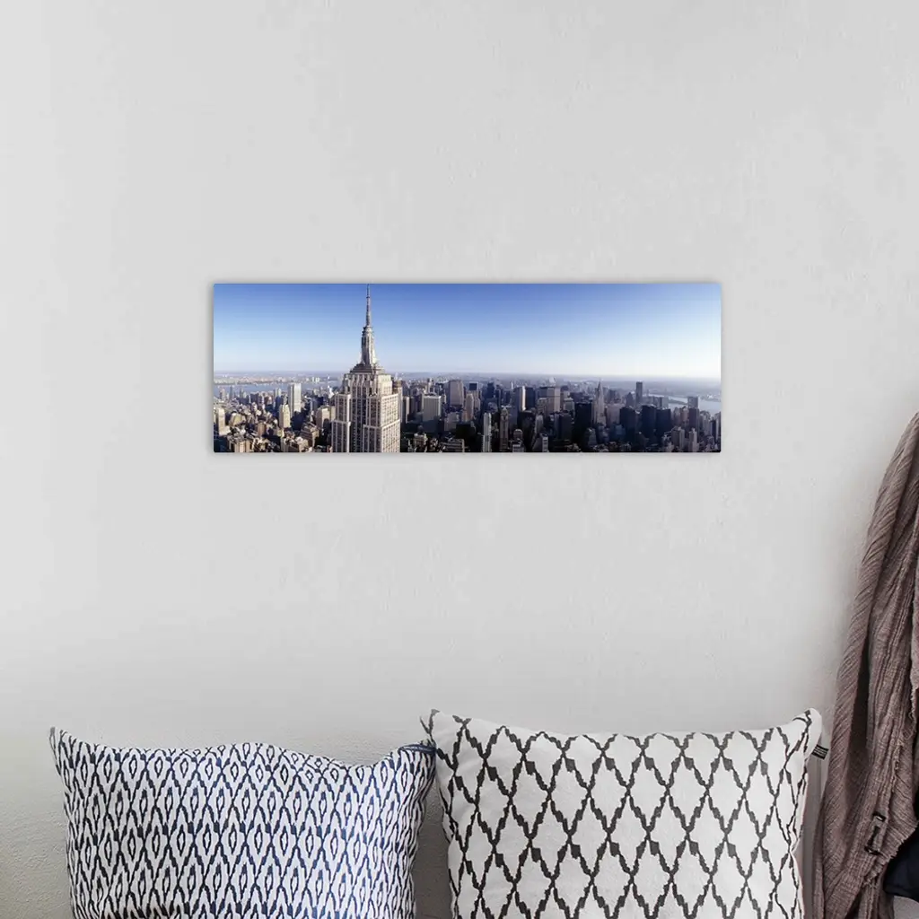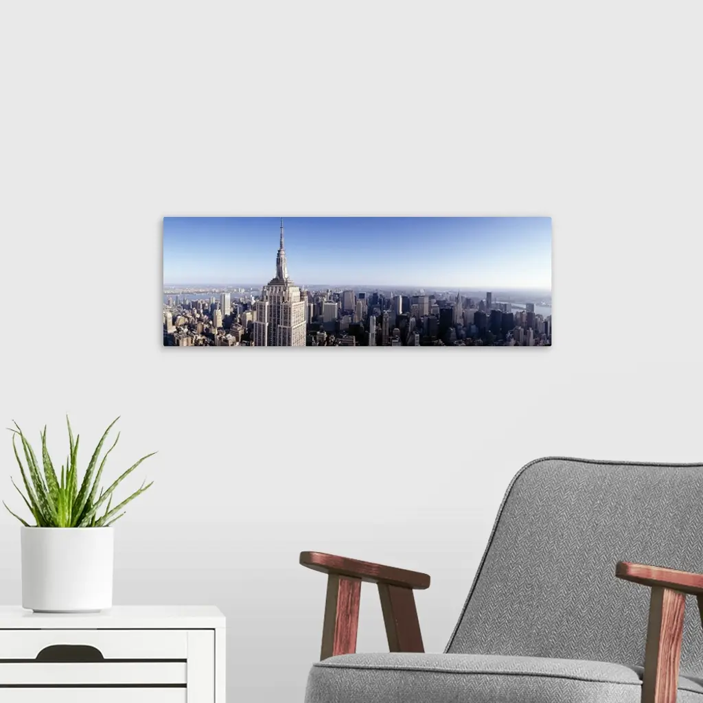 A high angle photograph of the NYC skyline with the Empire State building in the foreground towering over the skyscrapers.