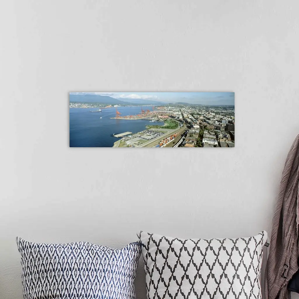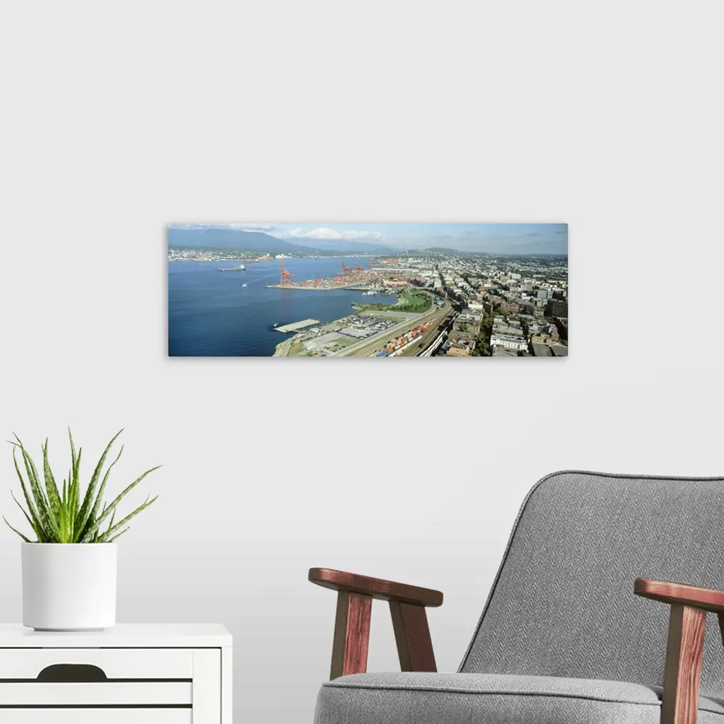 Aerial view of a harbor and buildings in a city, Vancouver, British Columbia, Canada wall art for home and office decor. Discover canvas art prints, photos, mural, big canvas art and framed wall art in GreatBigCanvas.com's varied collections.