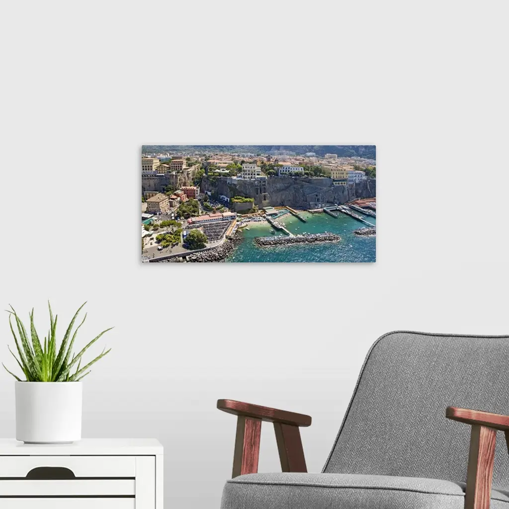 Aerial view of a town Sorrento Marina Piccola Naples Campania Italy wall art for home and office decor. Discover canvas art prints, photos, mural, big canvas art and framed wall art in GreatBigCanvas.com's varied collections.