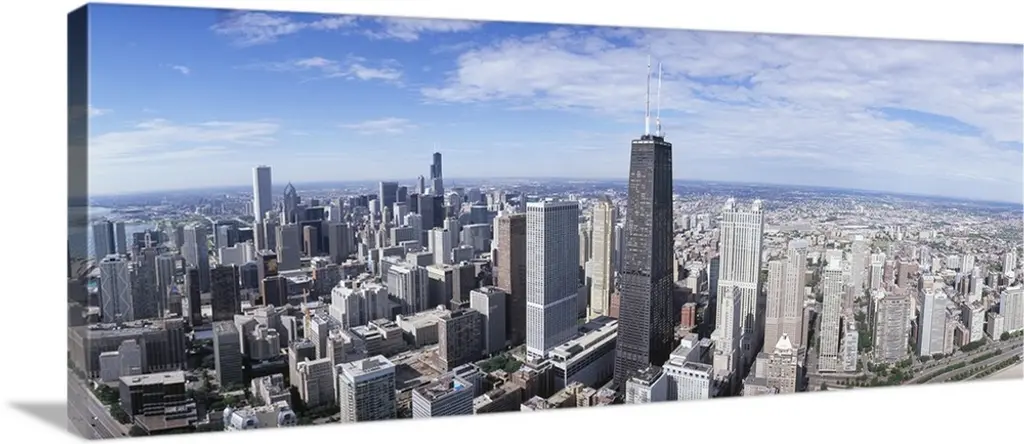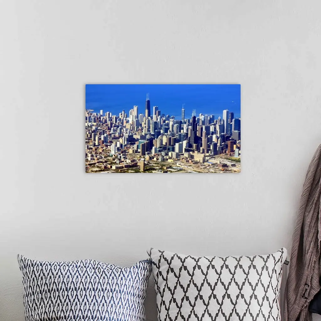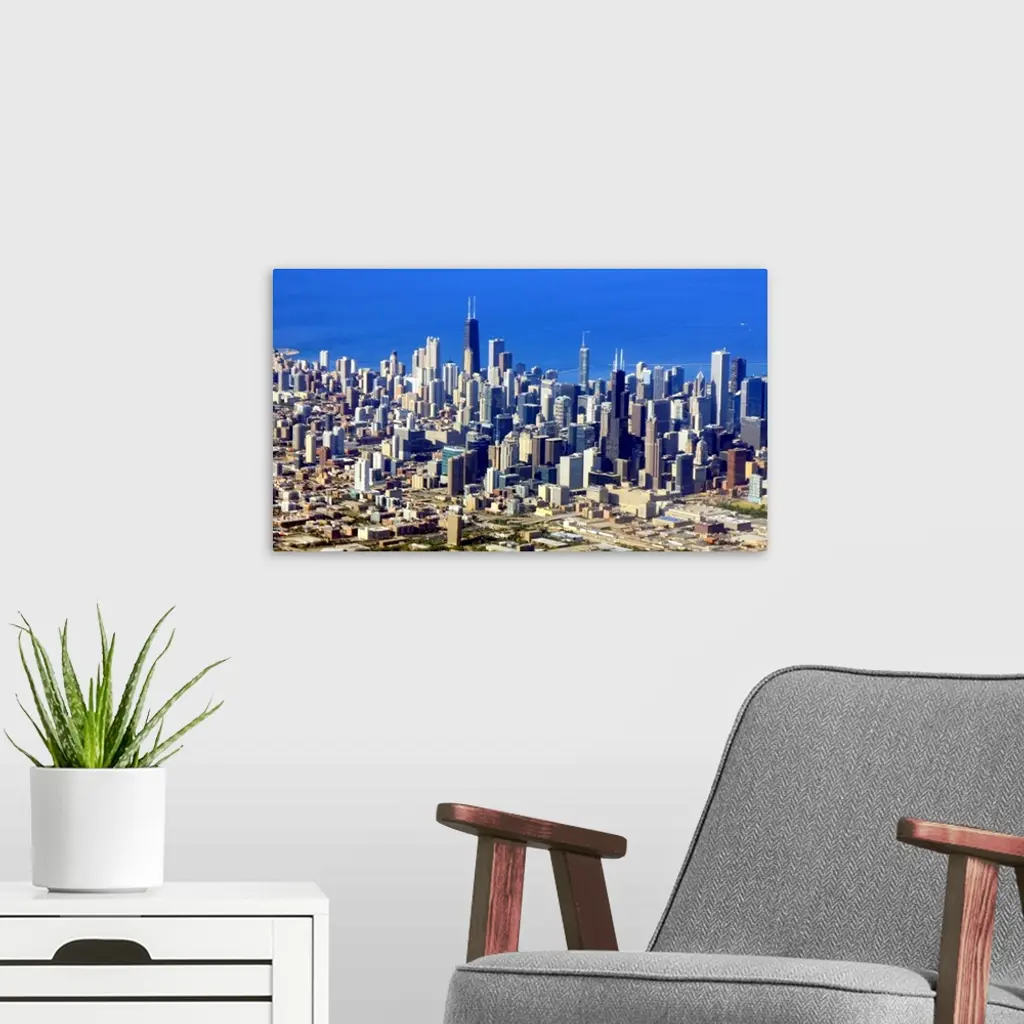 Aerial view of Chicago Downtown with Lake Michigan in background. wall art for home and office decor. Discover canvas art prints, photos, mural, big canvas art and framed wall art in GreatBigCanvas.com's varied collections.