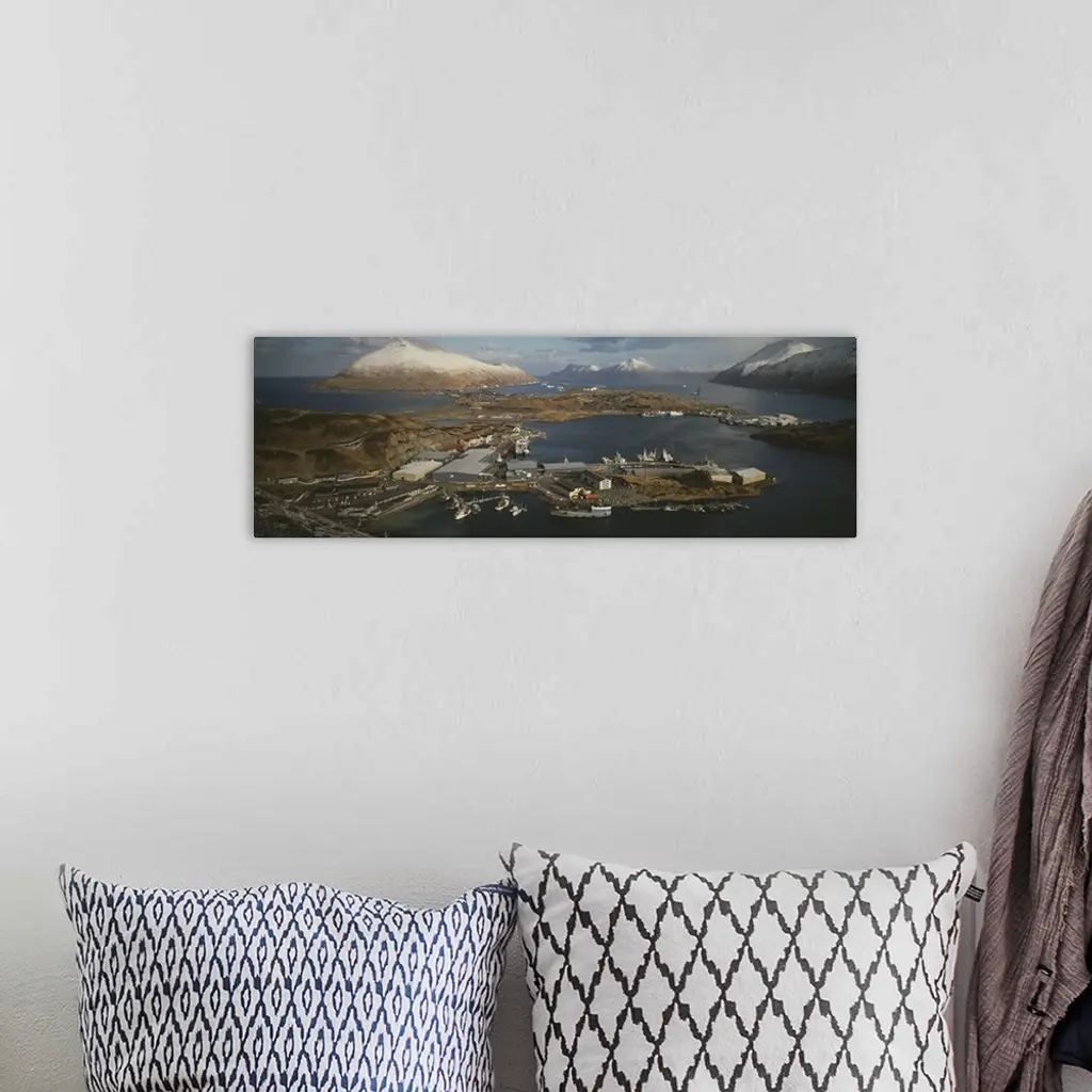Aerial view of fishing industry, Unisea Port Complex, Dutch Harbor, Alaska wall art for home and office decor. Discover canvas art prints, photos, mural, big canvas art and framed wall art in GreatBigCanvas.com's varied collections.