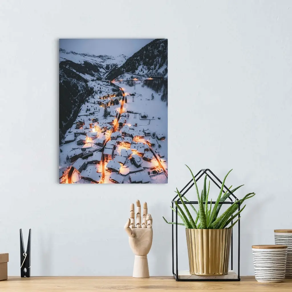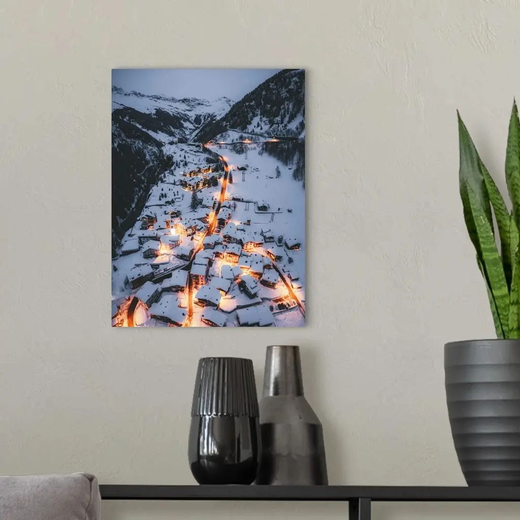 Aerial View Of Illuminated Mountain Huts Covered With Snow, Lombardy, Italy