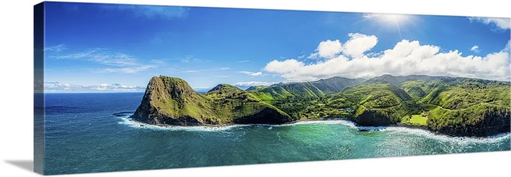 Panoramic photograph of mountainous shoreline under a cloudy sky.