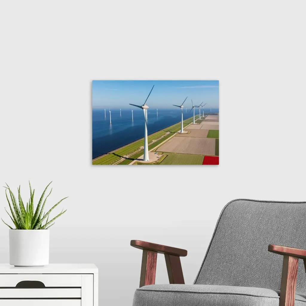 Aerial View Of Wind Turbines At Sea, North Holland, Netherlands