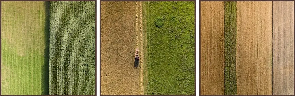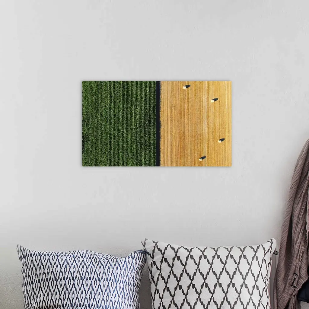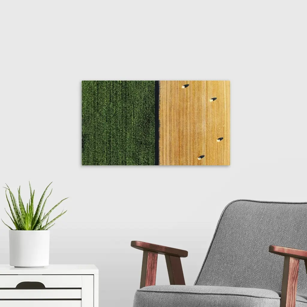 Aerial View On Green Corn And Yellow Field With Hay Bales