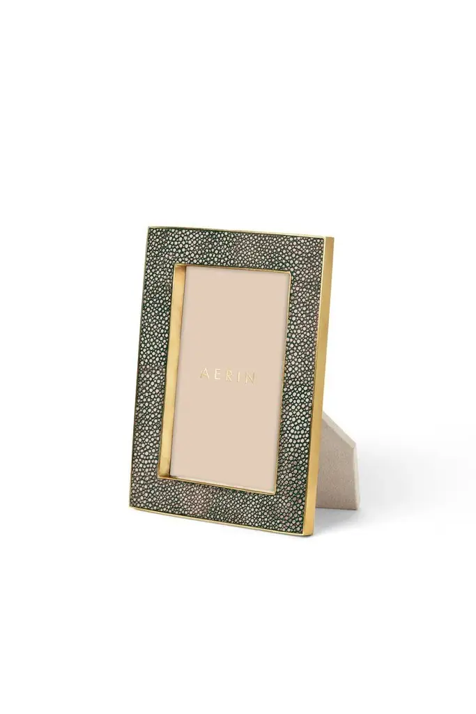 This modern yet classic frame juxtaposes the luxury and texture of embossed Faux Shagreen trimmed in polished brass. The versatile color elegantly displays a favorite family photo or a small piece of art. Care Instructions: Keep out of direct sunlight to avoid fading. Wipe clean with a damp non-abrasive cloth.