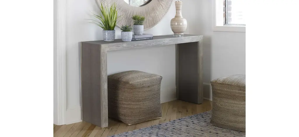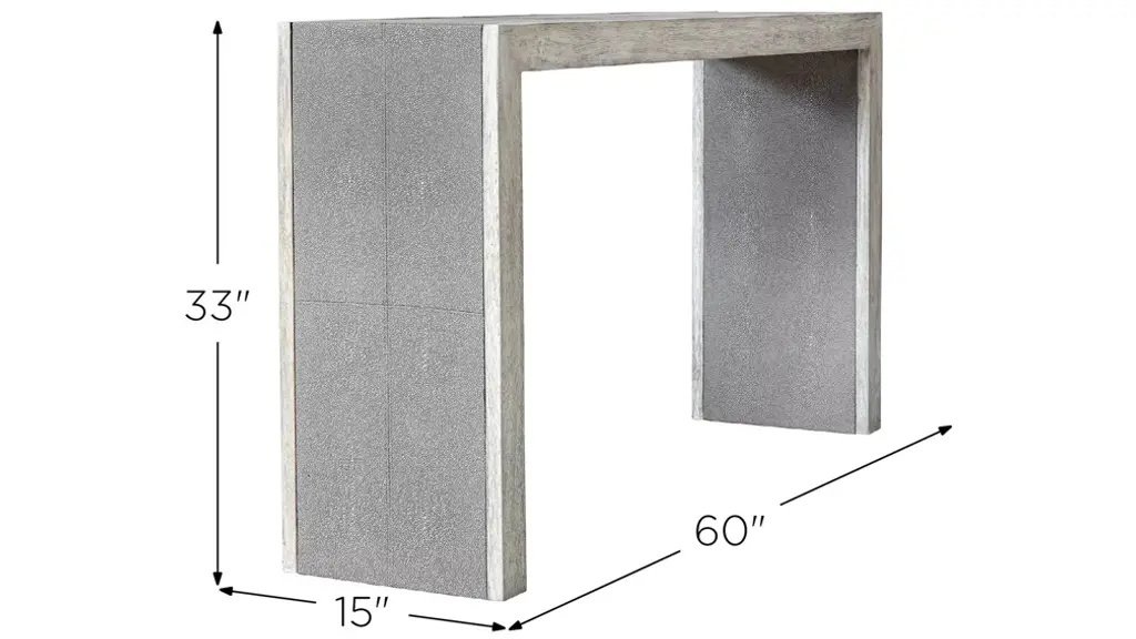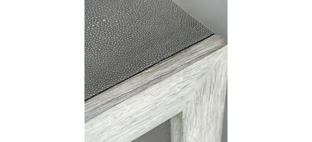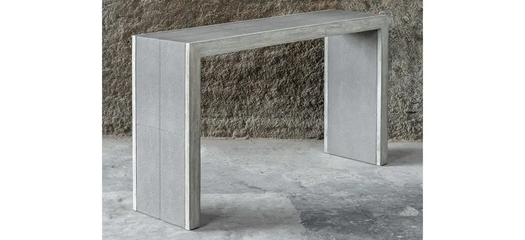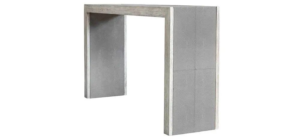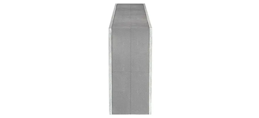 With modern elements, this transitional Aerina Console Table features stitched panels of light gray faux shagreen, paired with a contrasting wood finish in an aged white with gray distressed details.