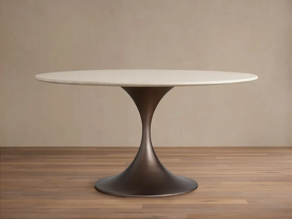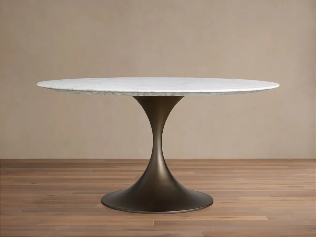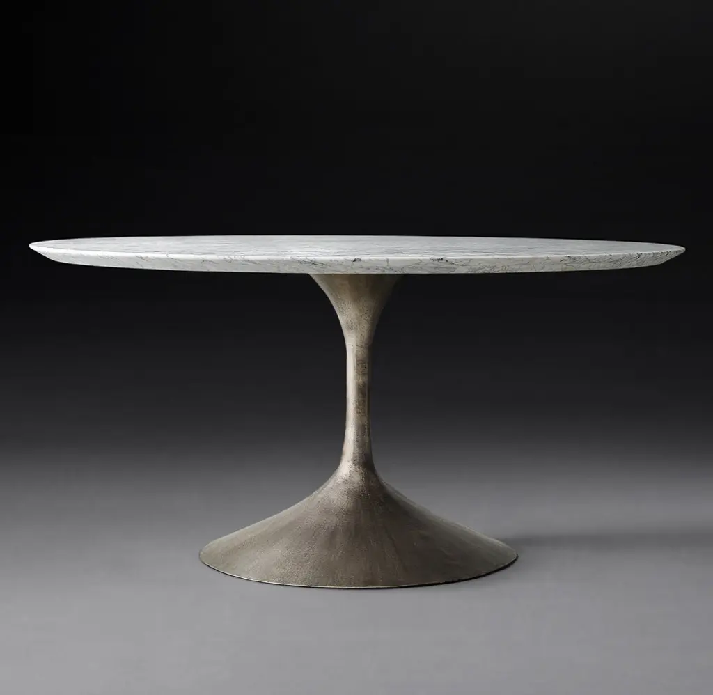 Paying homage to the sweeping lines of midcentury furnishings, our table is a study in simplicity. Defined by its balanced proportions and arching, sculptural curves, our interpretation pairs a cast metal pedestal base with a bullnose marble top. SHOP THE ENTIRE COLLECTION