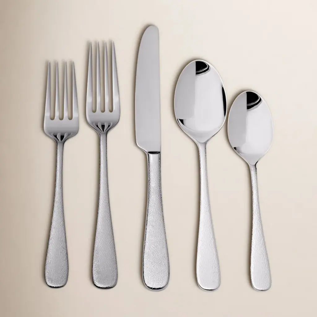 Aerodynamic and ultra-modern European flatware joins sculptural brushed heads to slender, tapered handles in matte white polymer. Finished by hand by skilled artisans, the stainless steel utensils are dishwasher-safe for ease of cleanup after weekday meals and festive family dinners. A Crate and Barrel exclusive, our Aero white 20-piece flatware set includes four salad forks, dinner forks, teaspoons, dinner spoons and dinner knives.