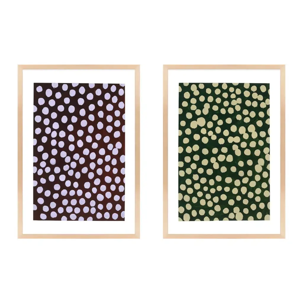 On the spot. Michela Sorrentino’s work juxtaposes organic + architectural shapes and unusual color combinations with dramatic mark-making that reflects an intuitive style. Printed on paper in the USA, this two-piece print set arrives in wooden frames with included hanging hardware.