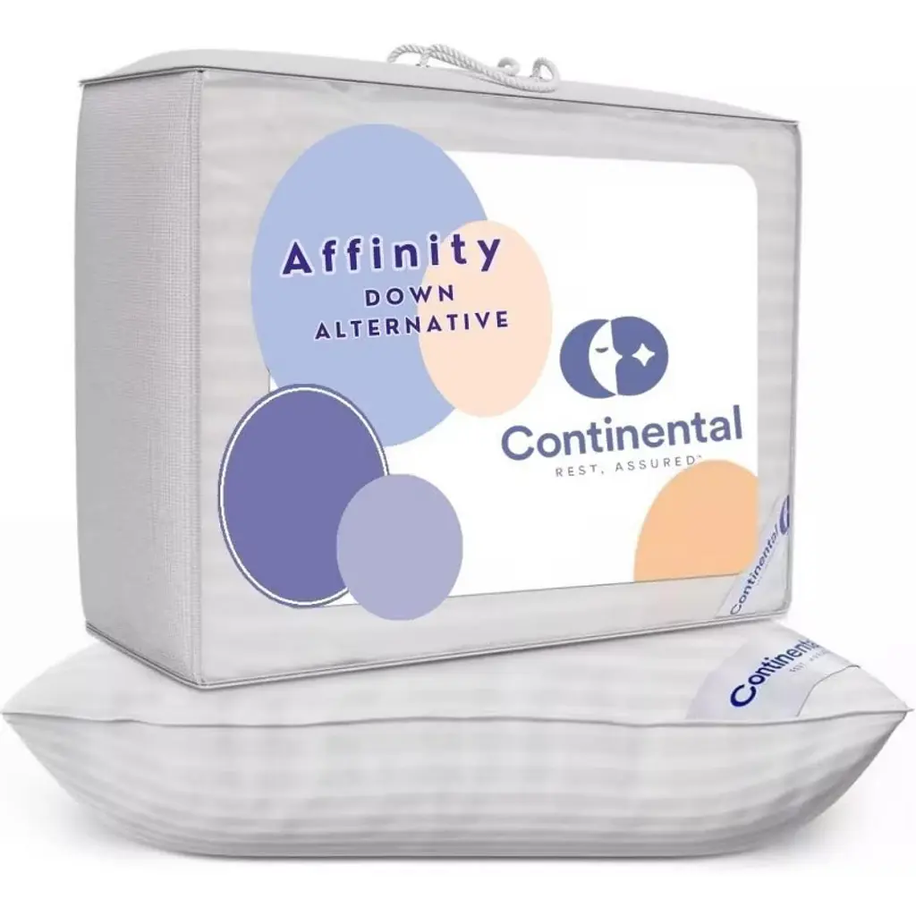 Refresh your sleep setup with the Continental Bedding Affinity Collection Down Alternative Pillows - 2 Pack. Designed for all sleep styles, these plush pillows are filled with a premium down alternative fiber that provides soft, supportive comfort without the allergens. Each pillow is wrapped in a breathable 100% cotton shell, offering a cool and smooth surface throughout the night. Whether you're outfitting your own bed, a dorm room, or a guest space, this convenient 2-pack is a practical and cozy upgrade. Available in Standard, Super Standard, Queen, and King sizes, these pillows are machine washable, making them easy to keep clean and fresh. The Affinity Collection brings dependable comfort and classic style to any bedding arrangement.