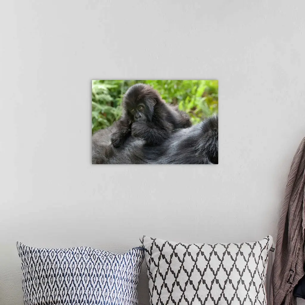 Africa, Rwanda, Volcanoes National Park, Young Mountain Gorilla On Its Mother's Back