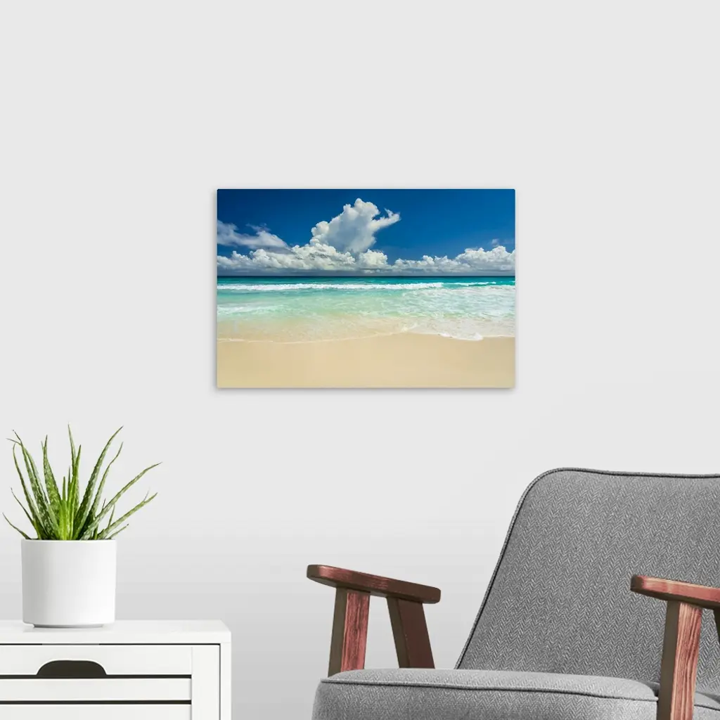 Africa, Seychelles, La Digue. Beach, sand, waves, clouds at Grand Anse.