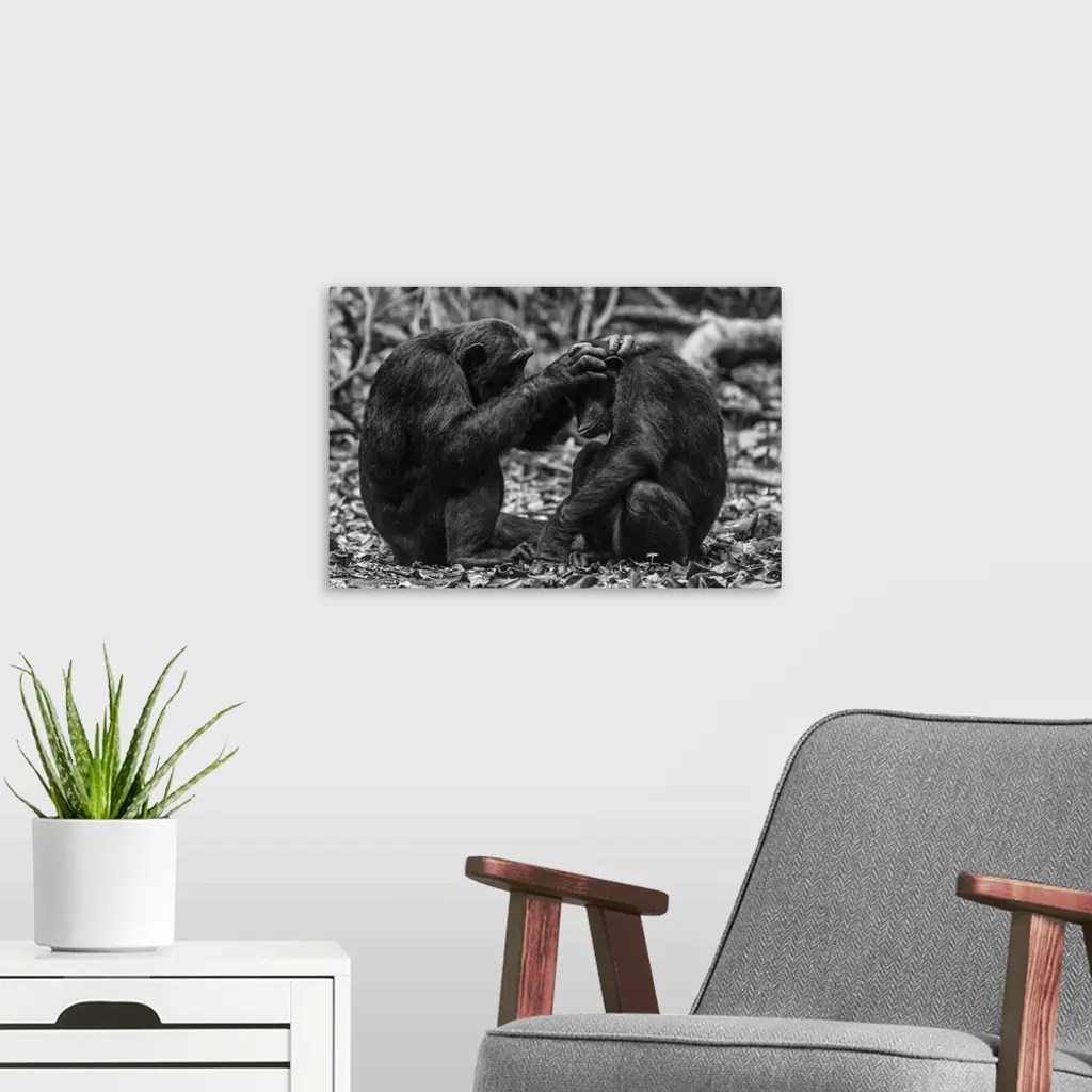 Africa, Tanzania, Mahale Mountains National Park. Black and white picture of two chimps grooming.