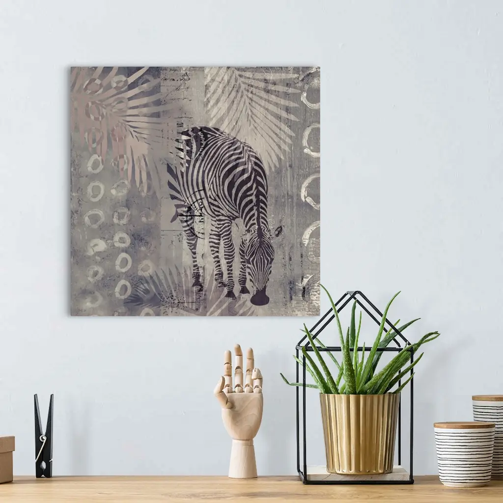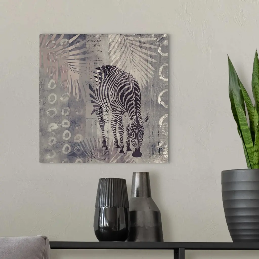 Modern mixed media art with wild zebra in muted and neutral colors.