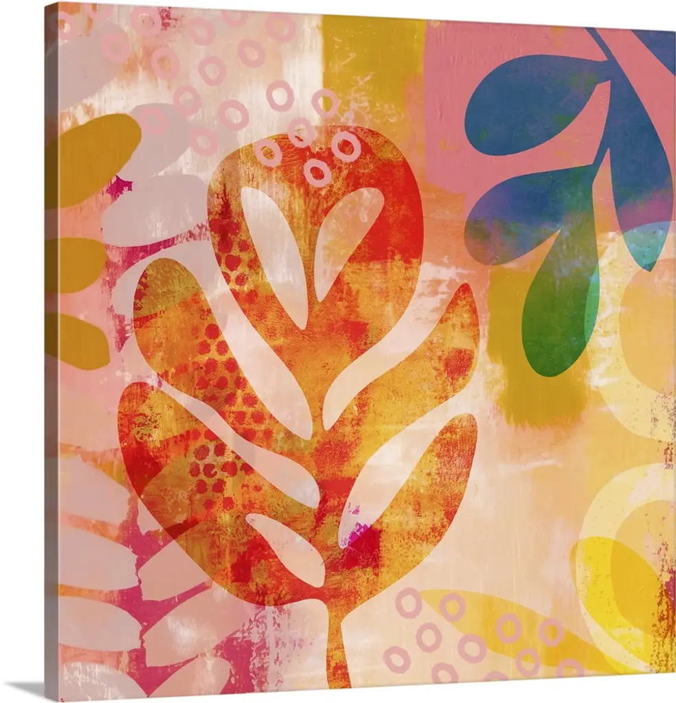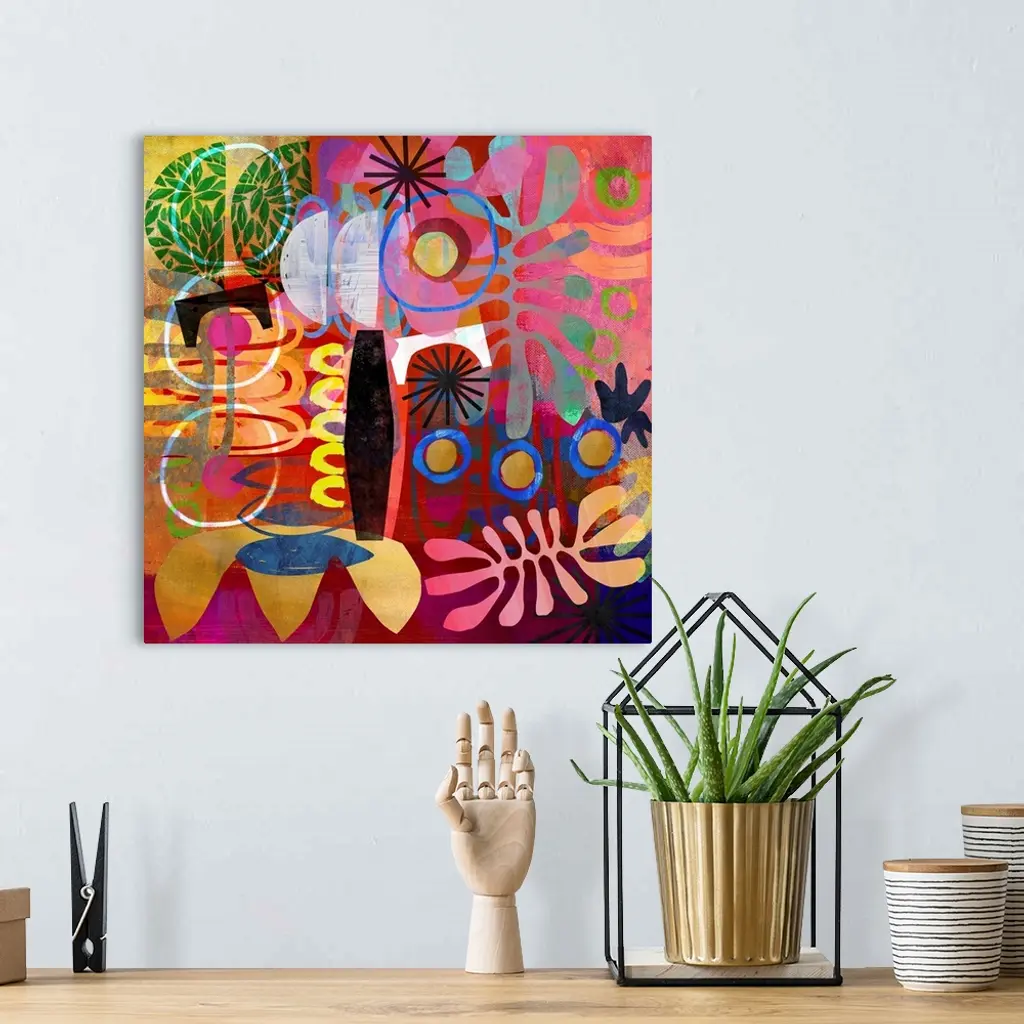 A riotous jumble of abstract shapes in warm tones. A very impactful, maximalist work of art, it would fit perfectly into a glam, contemporary or bright mid century setting.