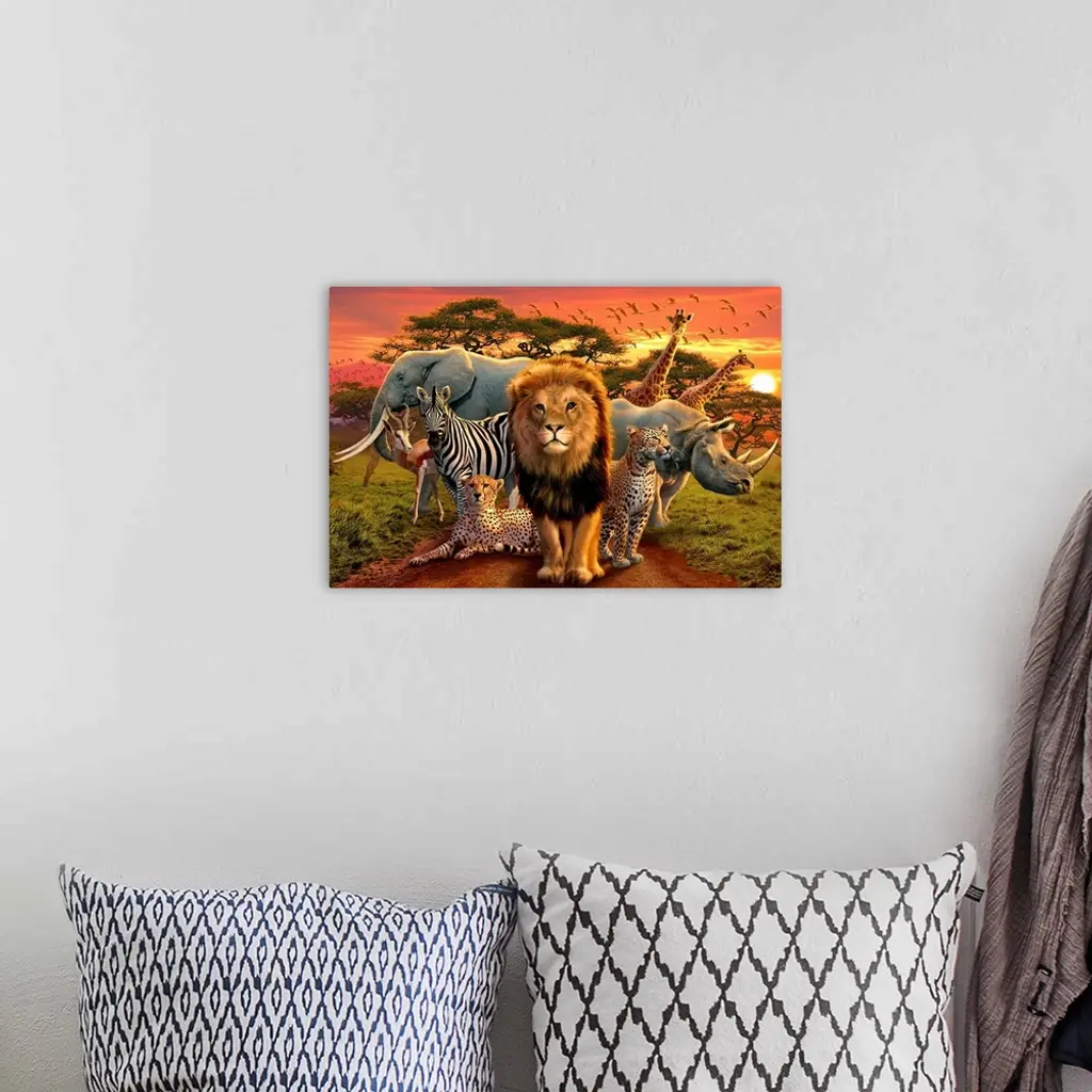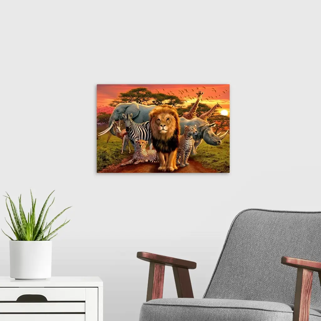 Large illustration of a lion, zebra, elephant, rhinoceros, gazelle, cheetahs, giraffes and birds as they occupy the plains of Africa filled with acacia trees during a sunset.